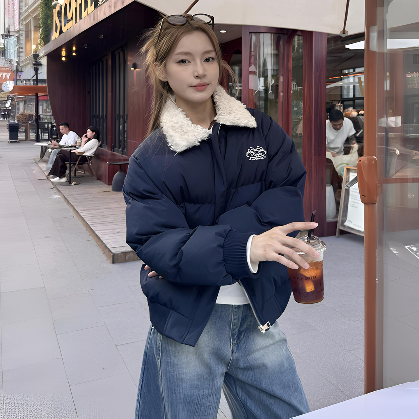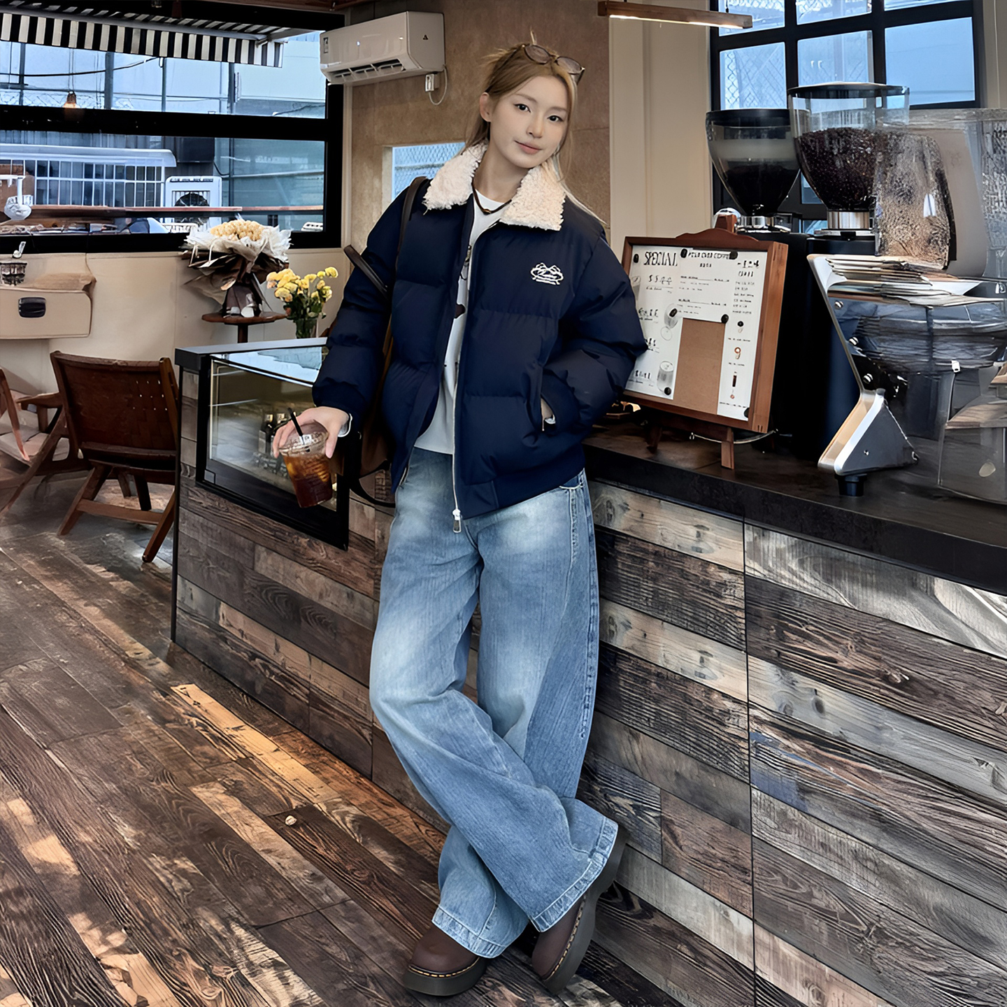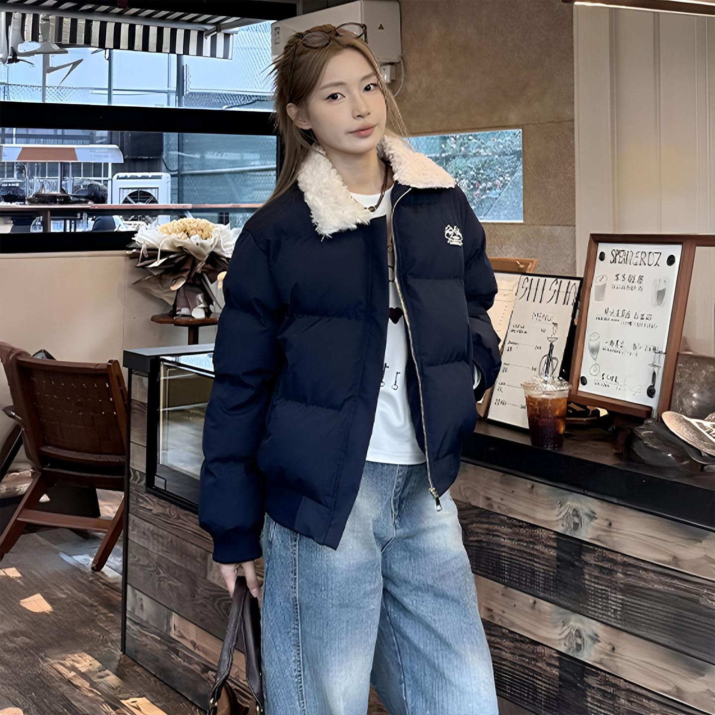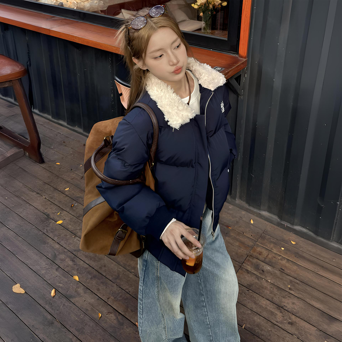 特大码胖mm简约慵懒风蓝色棉服外套女秋冬新款羊羔毛拼接翻领上衣