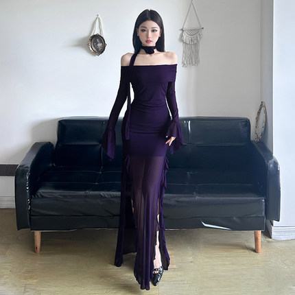 HEYOUNGIRL微醺玫瑰荷叶边开叉一字肩长袖连衣裙御姐性感紫色长裙