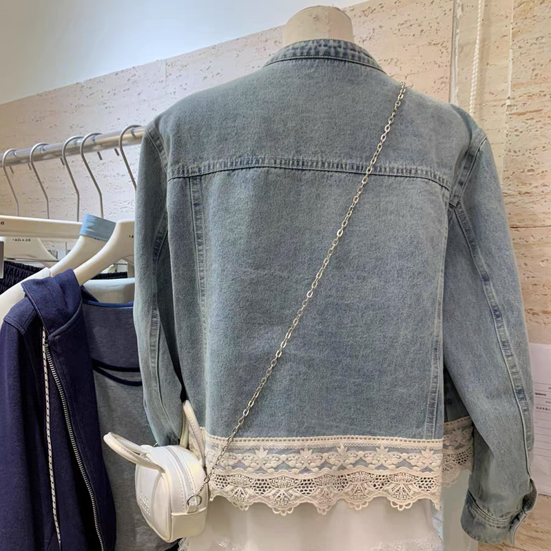 设计感2025春季新款蕾丝花边拼接水洗磨白牛仔外套女圆领短款上衣