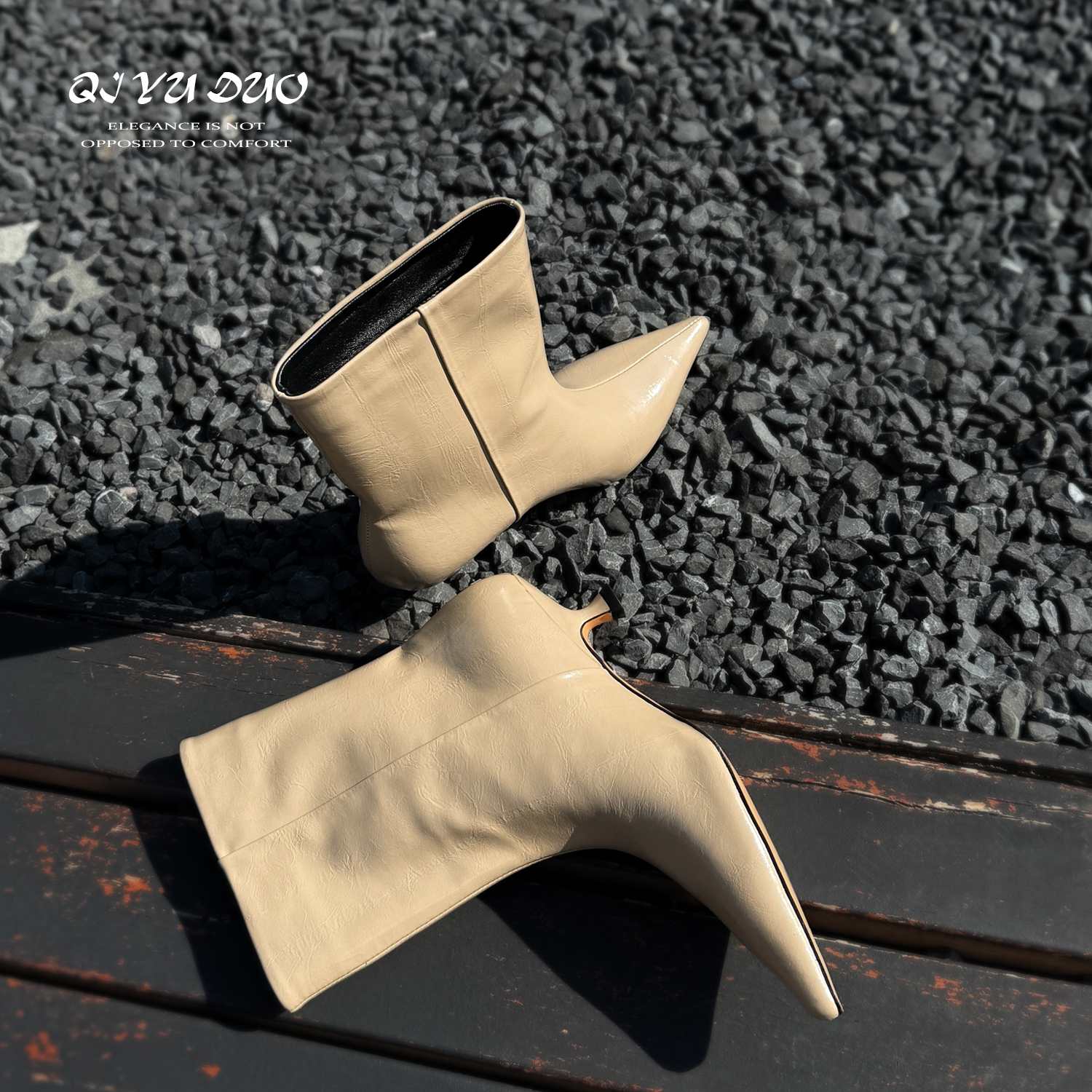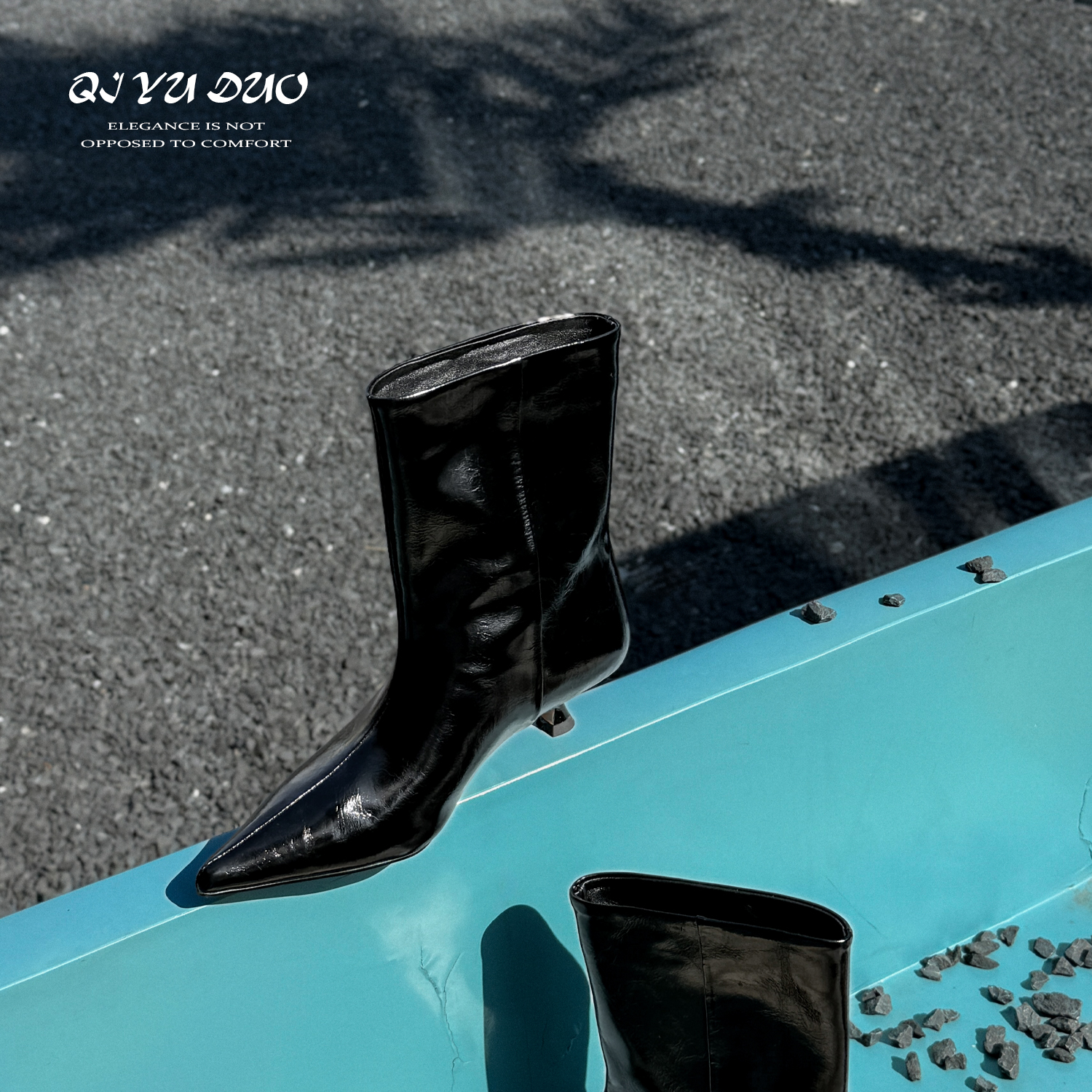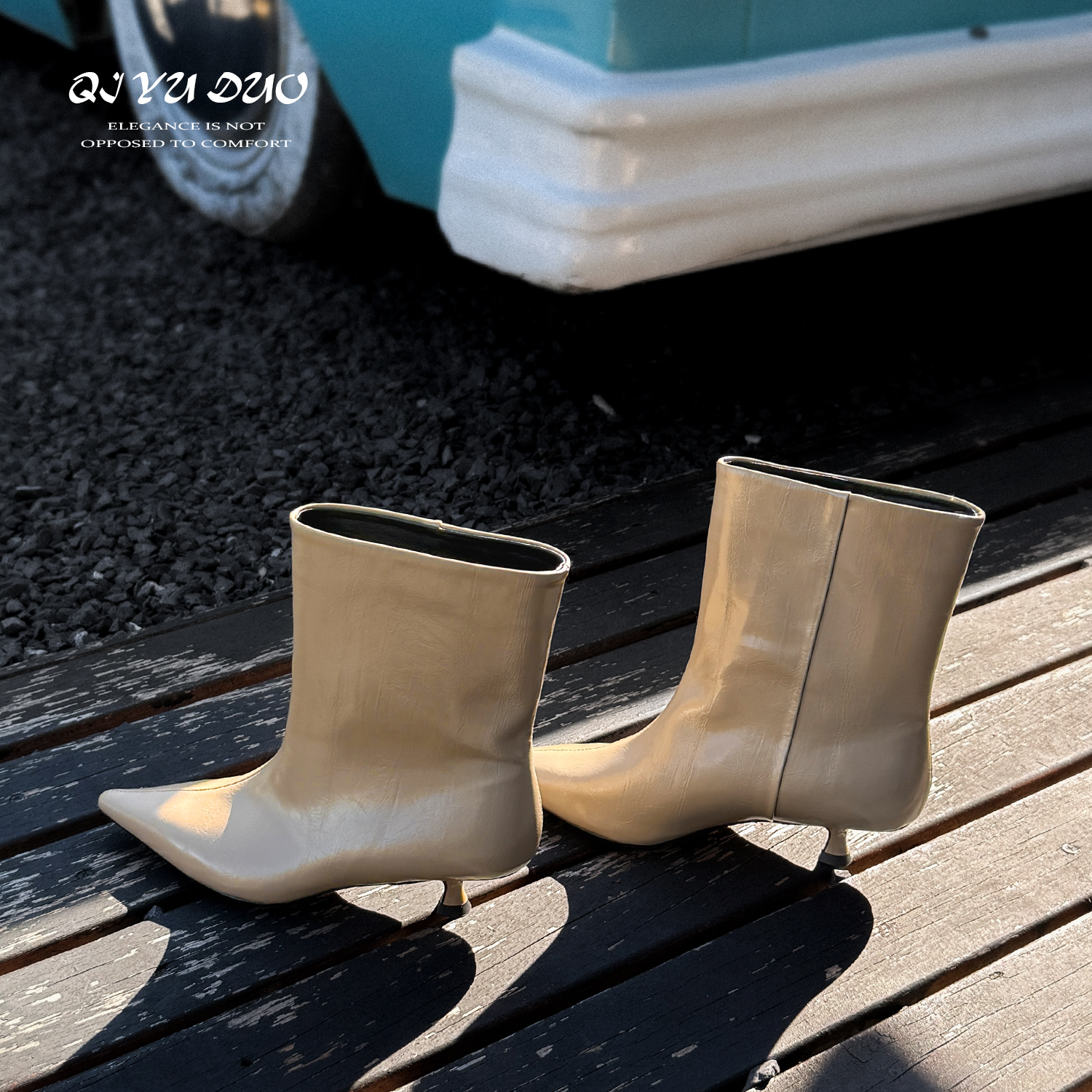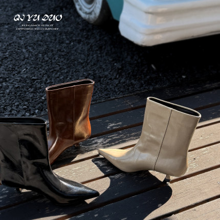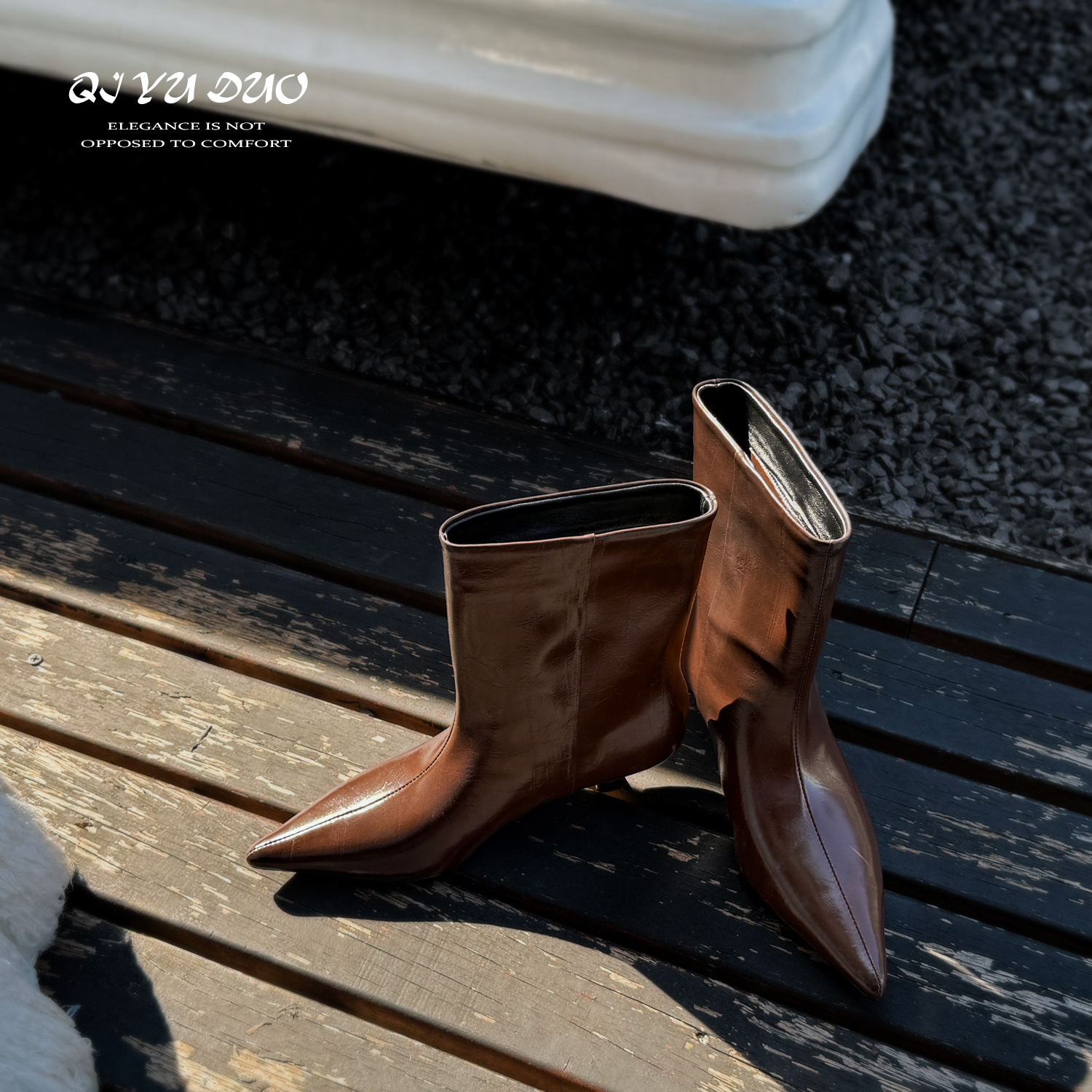 【七与多】牛皮/4cm/极简风尖头短靴女真皮小猫跟宽筒靴春秋单靴
