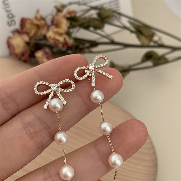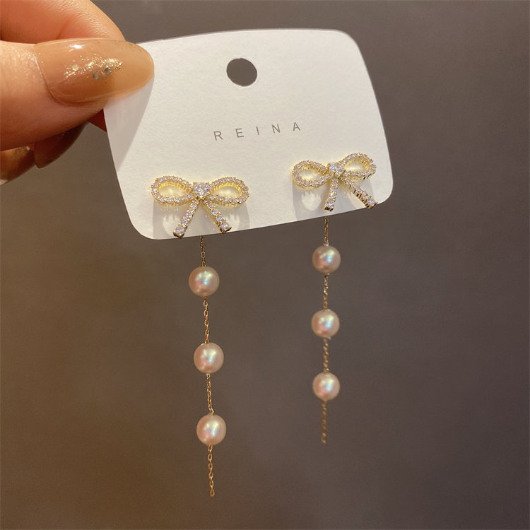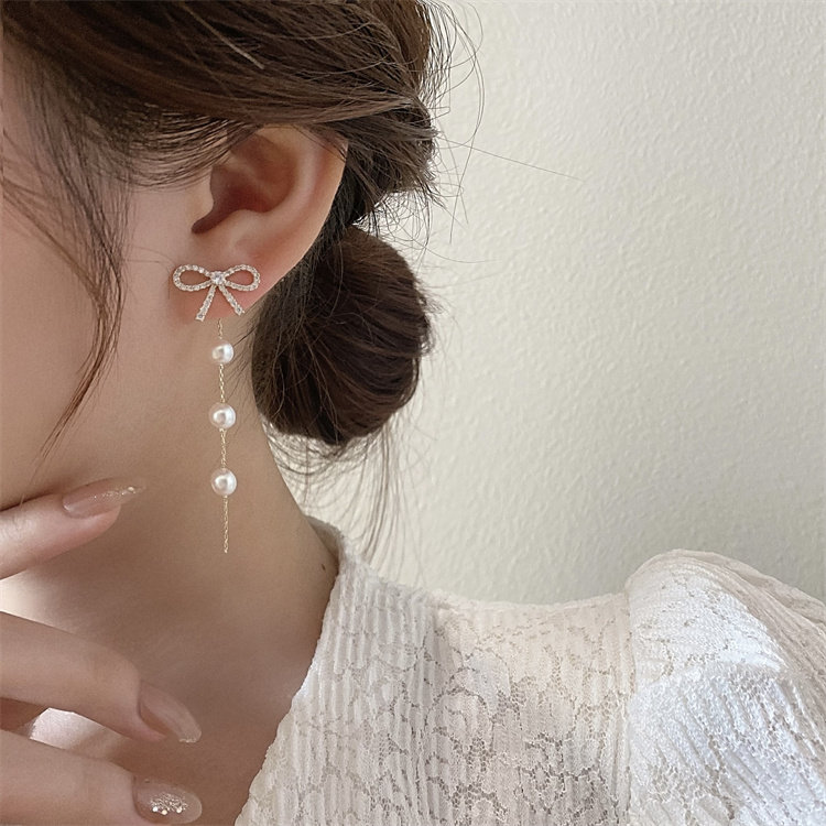 伊灿长款流苏珍珠耳坠蝴蝶结耳钉
