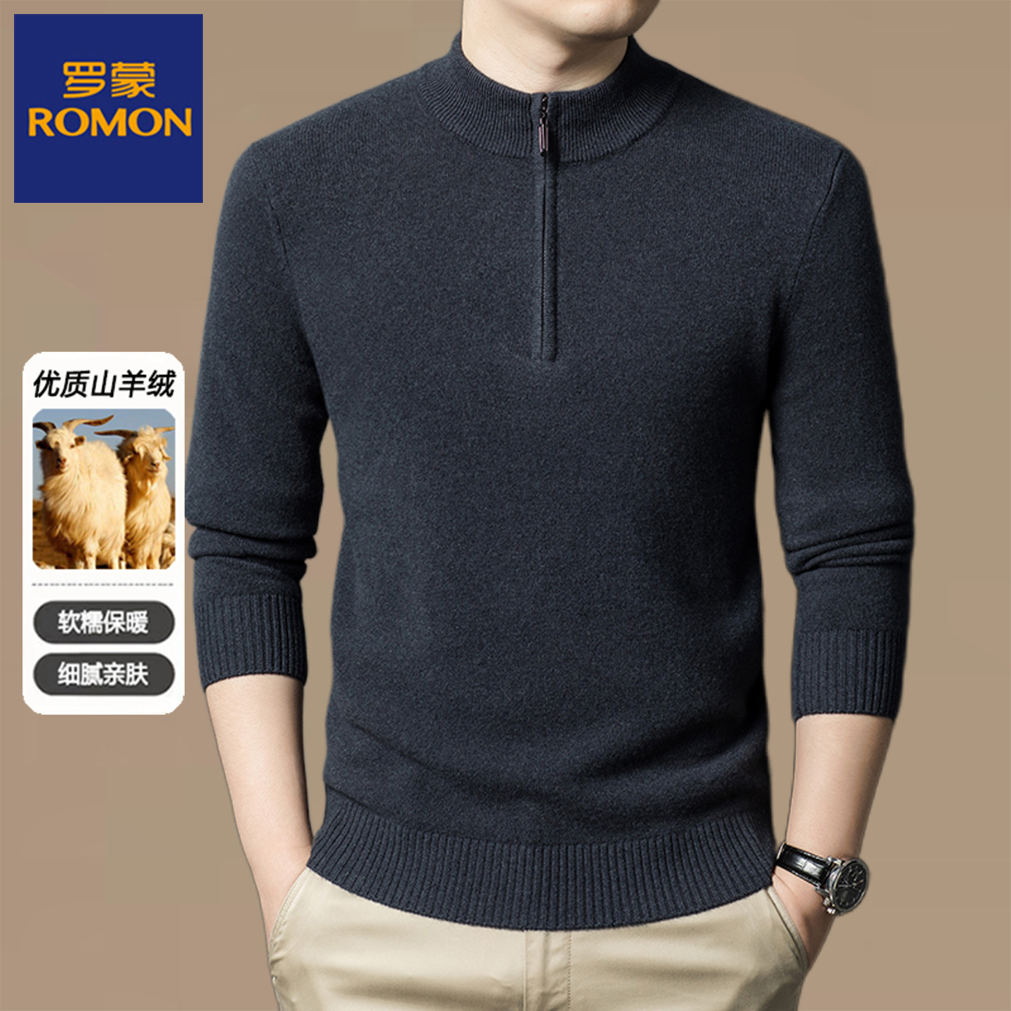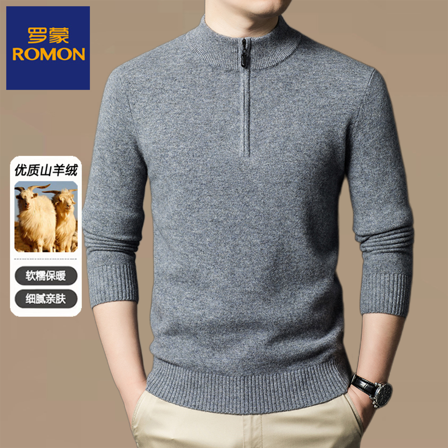 罗蒙男装秋冬厚款男士纯羊绒针织衫中老年半高领拉链套头毛衣男