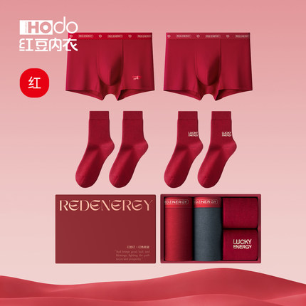 红豆红色能量内裤男士纯棉抗菌裆结婚马年本命年平角裤袜子礼盒装