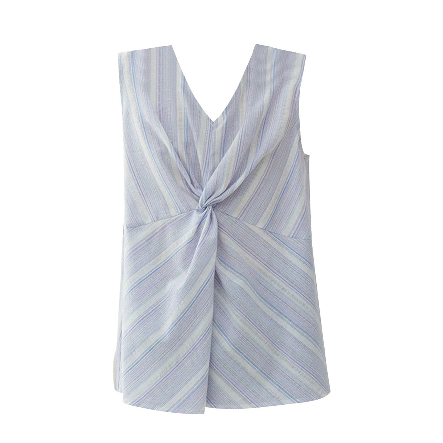 韩系简约百搭条纹无袖V领扭结衬衫女2025夏季新款宽松背心上衣ins