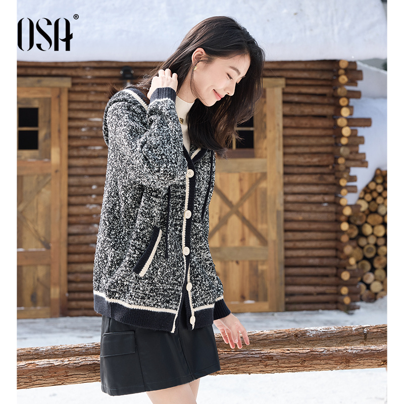 OSA欧莎复古连帽开衫外套2024年冬季新款女中长款慵懒风针织上衣