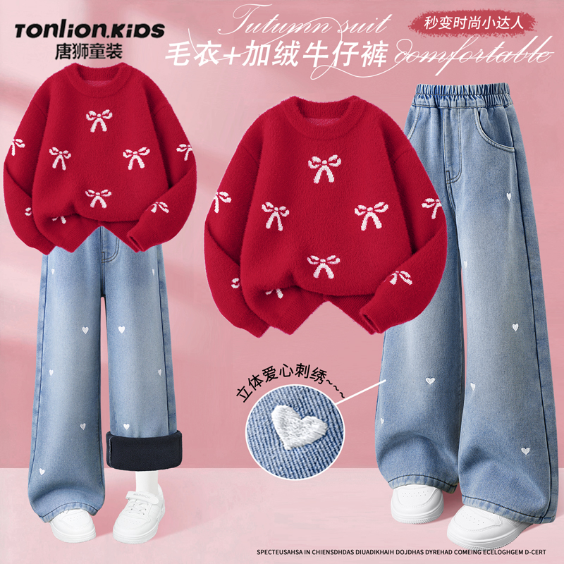 唐狮童装圣诞毛衣女童2025新款红色新年针织衫套装儿童加绒牛仔裤