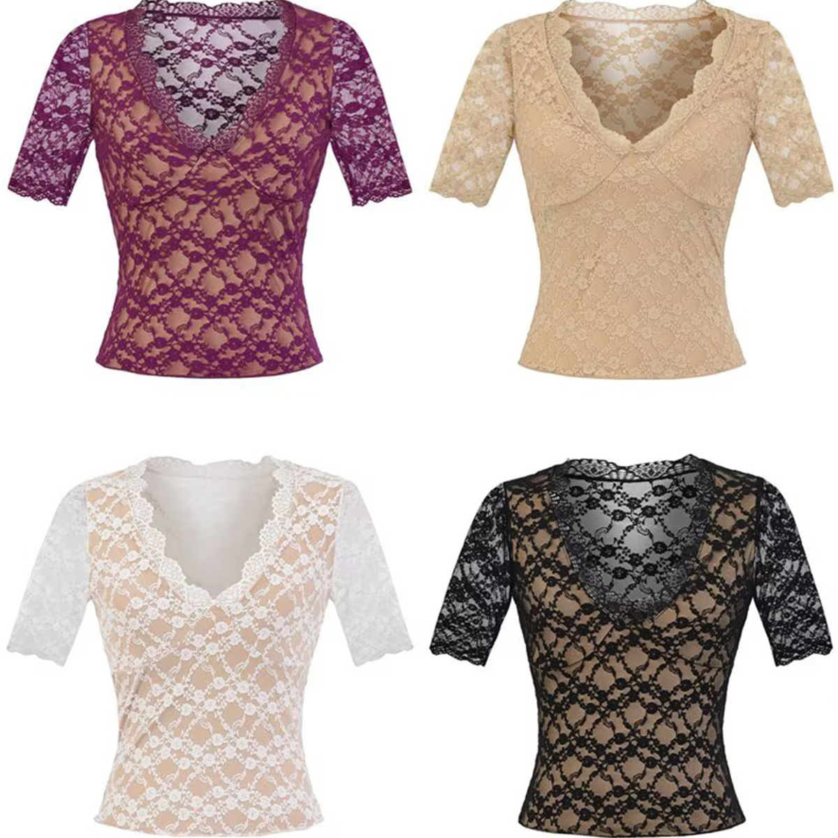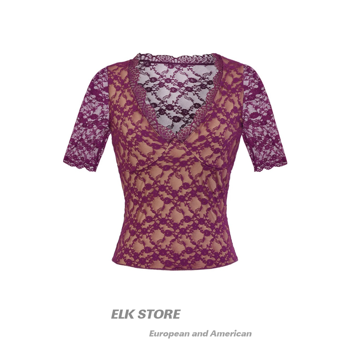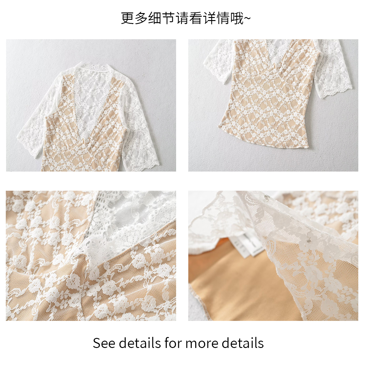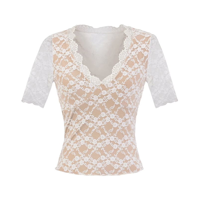 纯欲性感辣妹碎花v领短袖t恤女夏季修身显瘦蕾丝微透钩花气质上衣