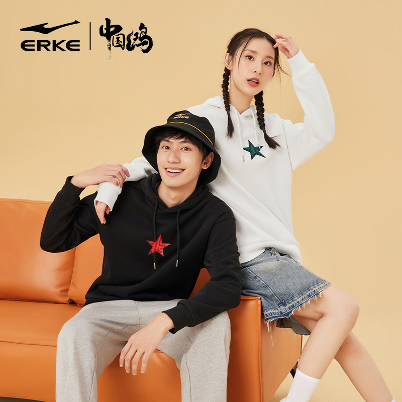 中国鸿丨鸿星尔克春秋男女情侣国潮复古加绒星星连帽卫衣运动上衣