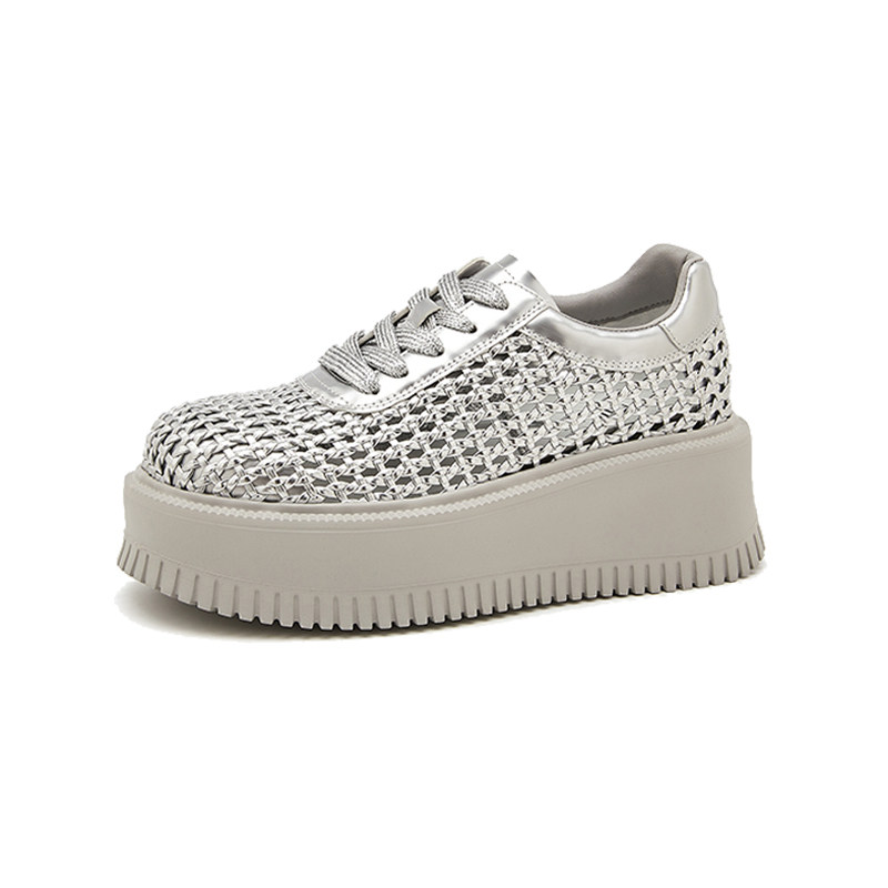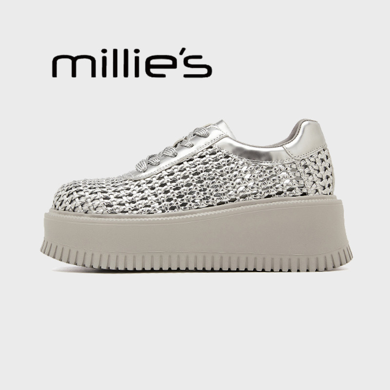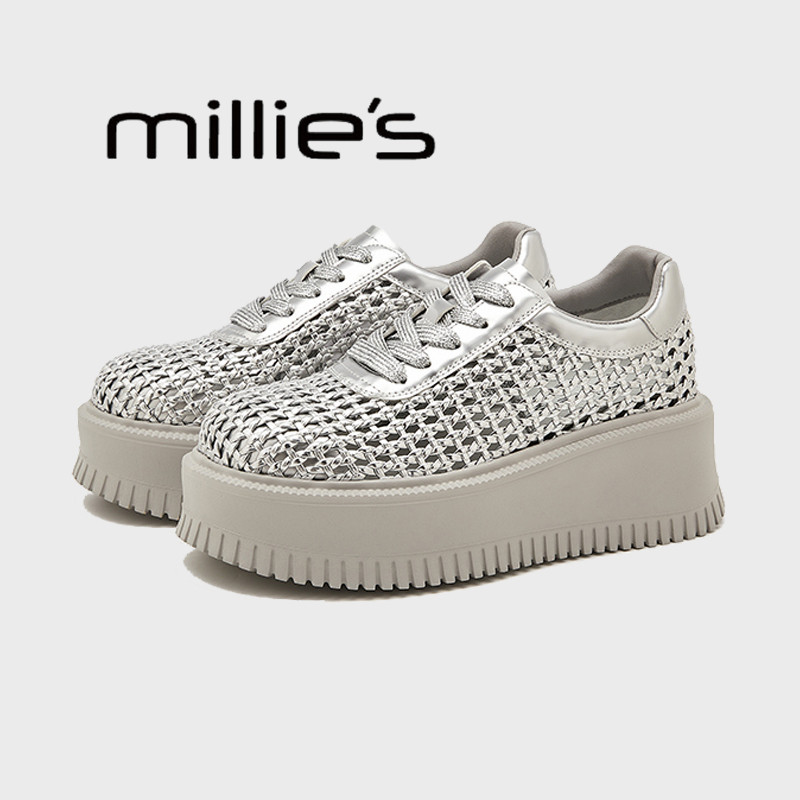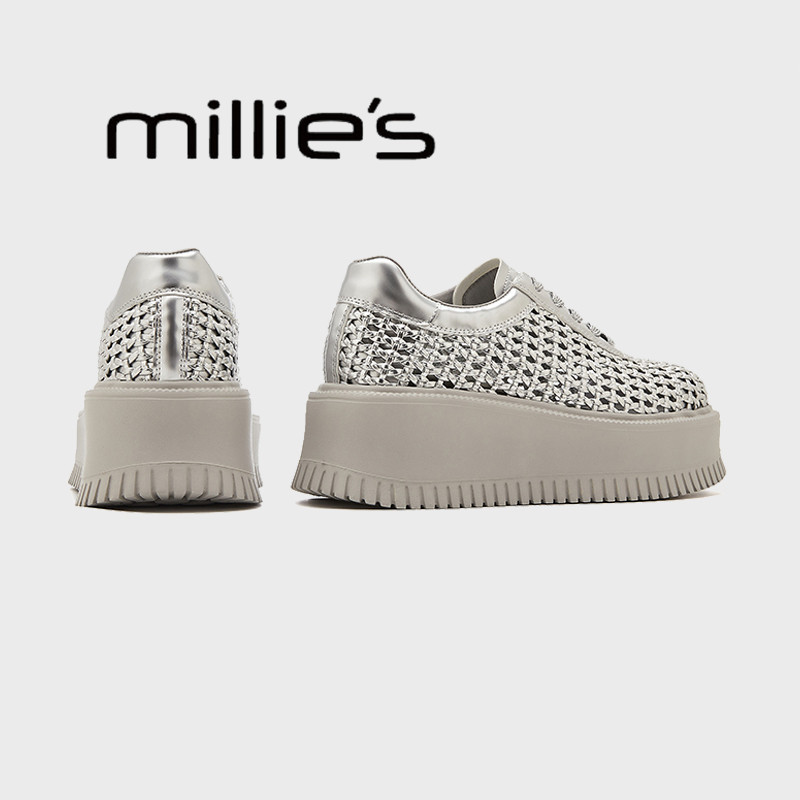 MILLIE'S/妙丽厚底高跟镂空网面编织透气2026夏新款银色增高板鞋
