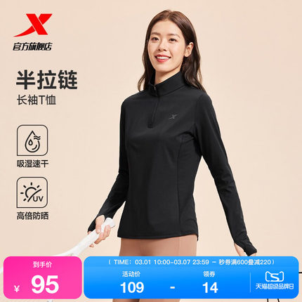 特步半拉链长袖T恤女官方秋季新款健身女装健身上衣跑步运动服
