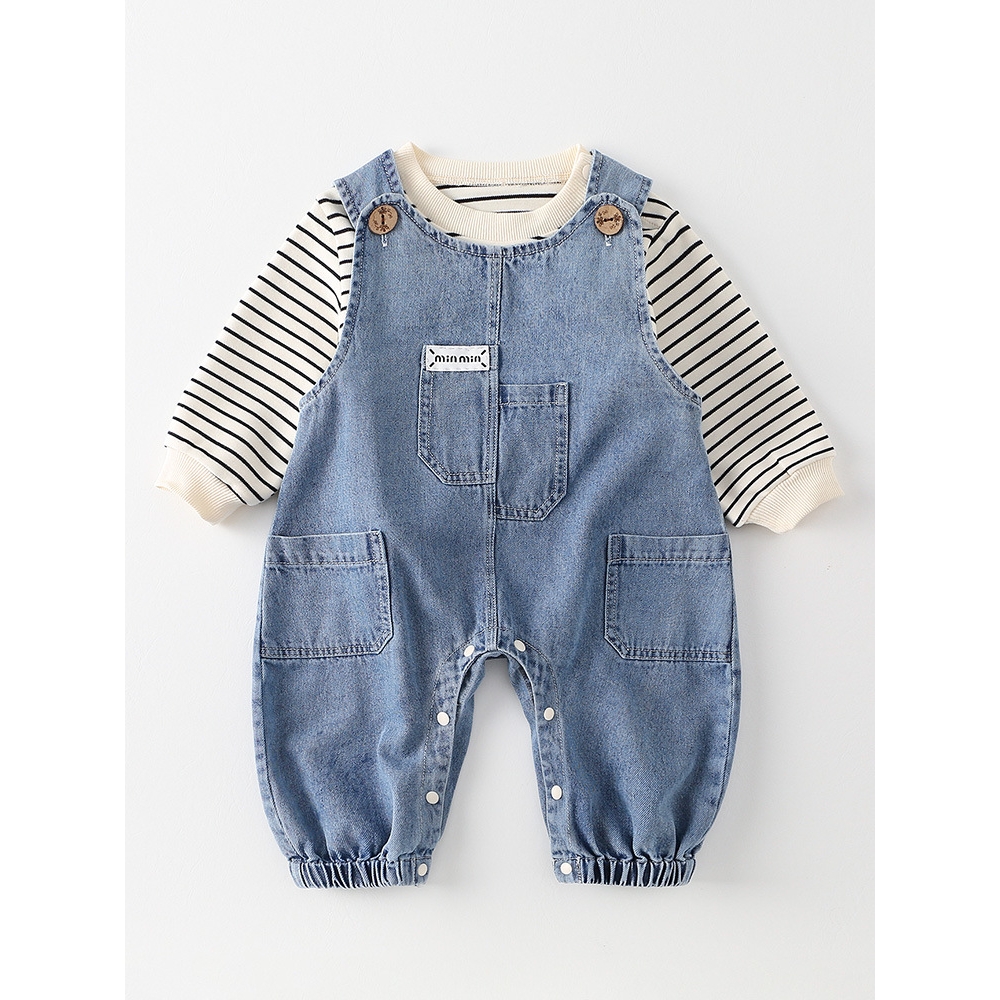 韩版婴幼儿衣服春季背带裤套装洋气男女宝宝牛仔爬服条纹t恤2件套