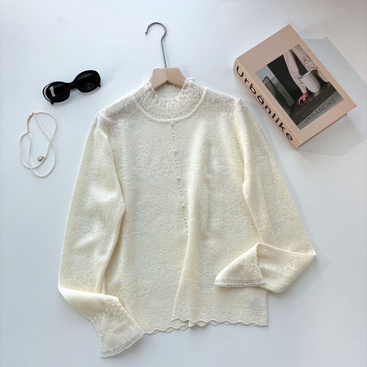 欧货2025秋装新款细羊毛衫半高领蕾丝边打底衫珍珠开叉白色毛衣女