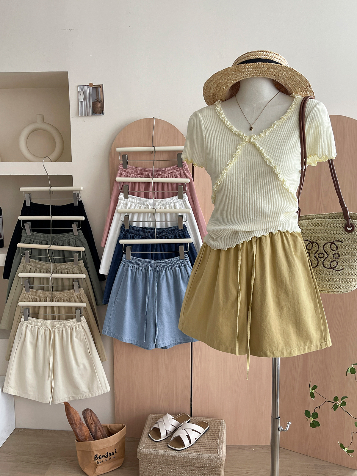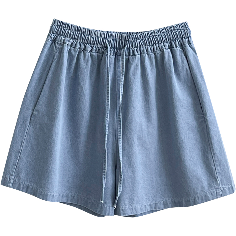 抽绳韩系复古松紧腰洗水棉牛仔阔腿短裤女夏休闲百搭显瘦外穿热裤