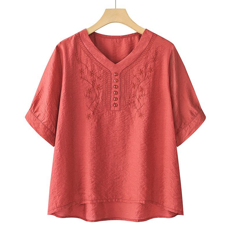 大码中老年妈妈减龄套装女300斤棉麻刺绣夏新时尚宽松短袖两件套