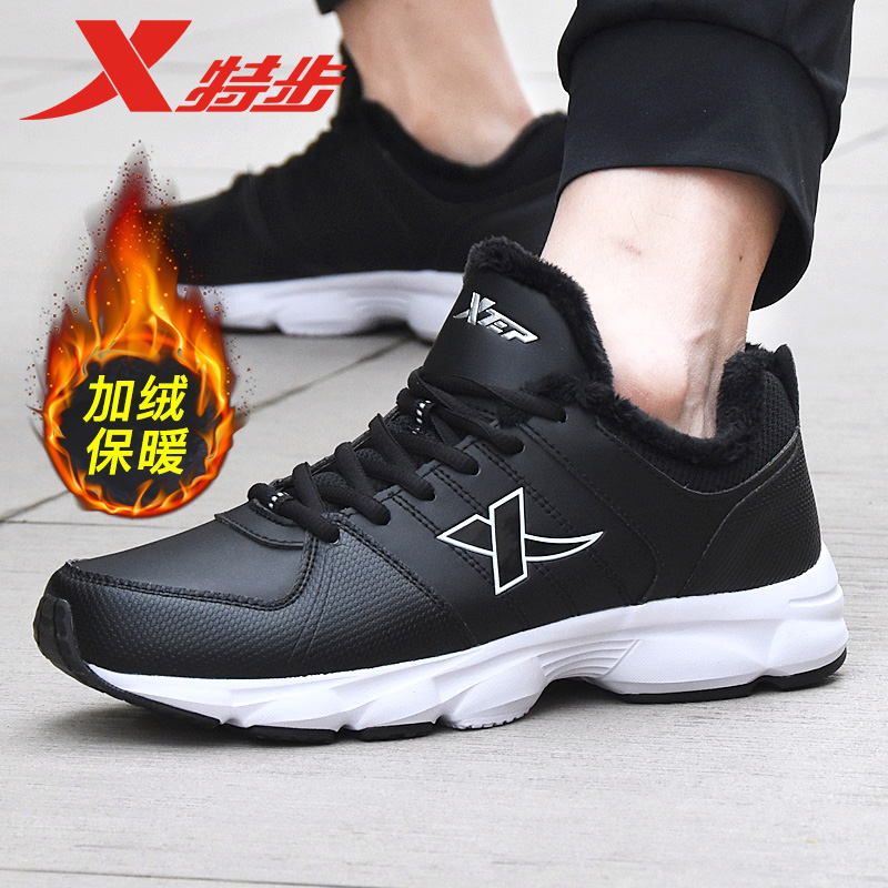 特步男鞋冬季加绒保暖跑步鞋男士皮面休闲鞋子秋冬防水运动鞋男款