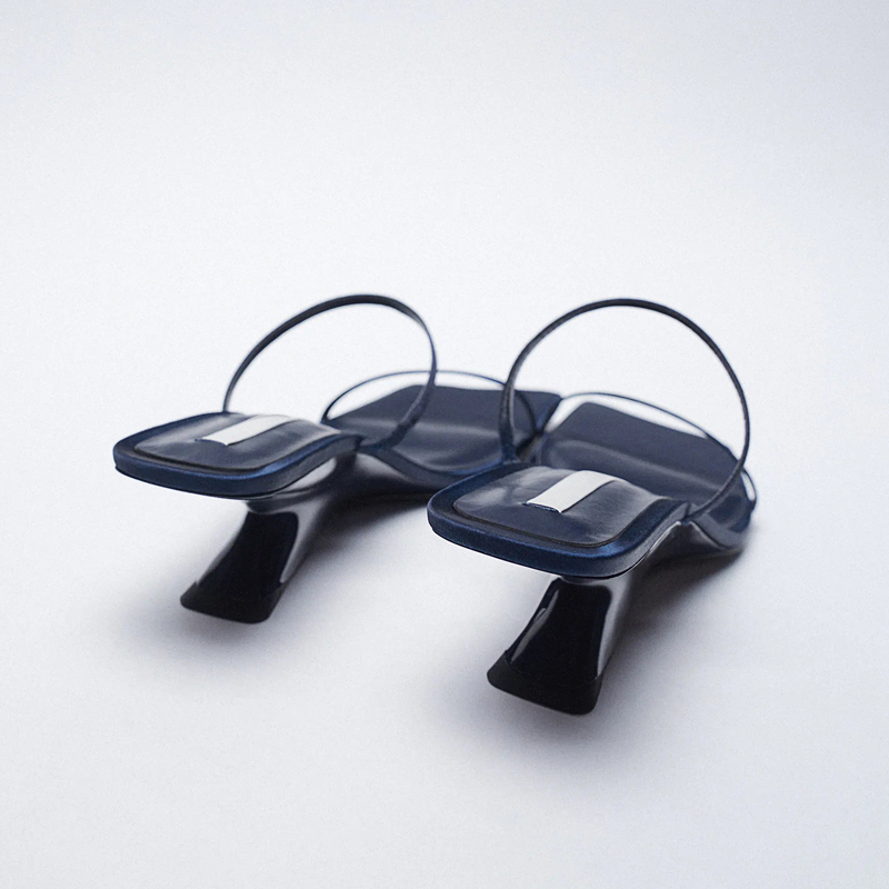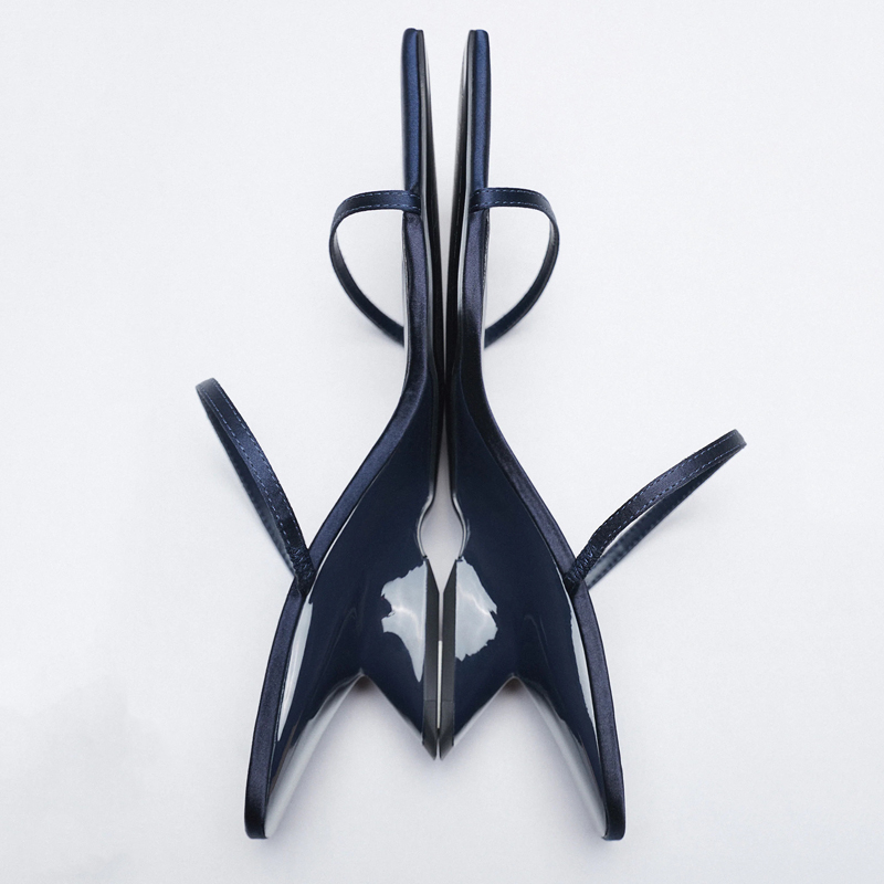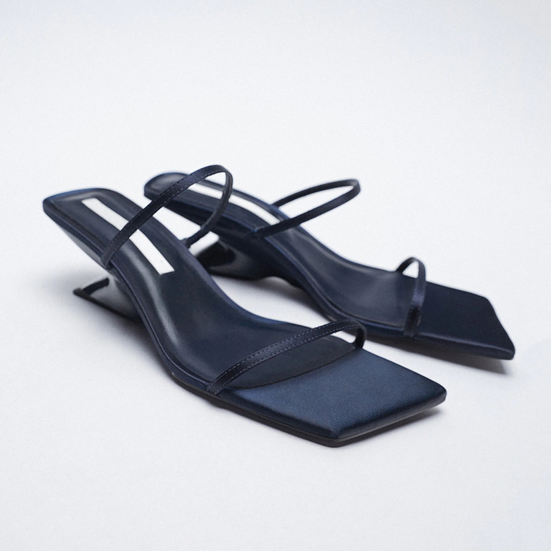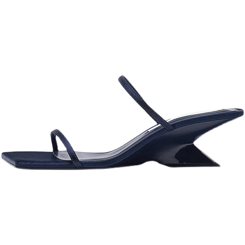 欧美风大码鞋夏季细带方头露趾凉鞋女坡跟一脚蹬性感高跟一字拖鞋