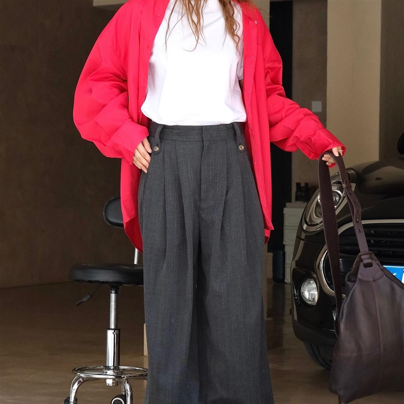 极速羊毛灰色条纹西裤秋冬新款?D韩版质感宽松挺括休闲长裤女