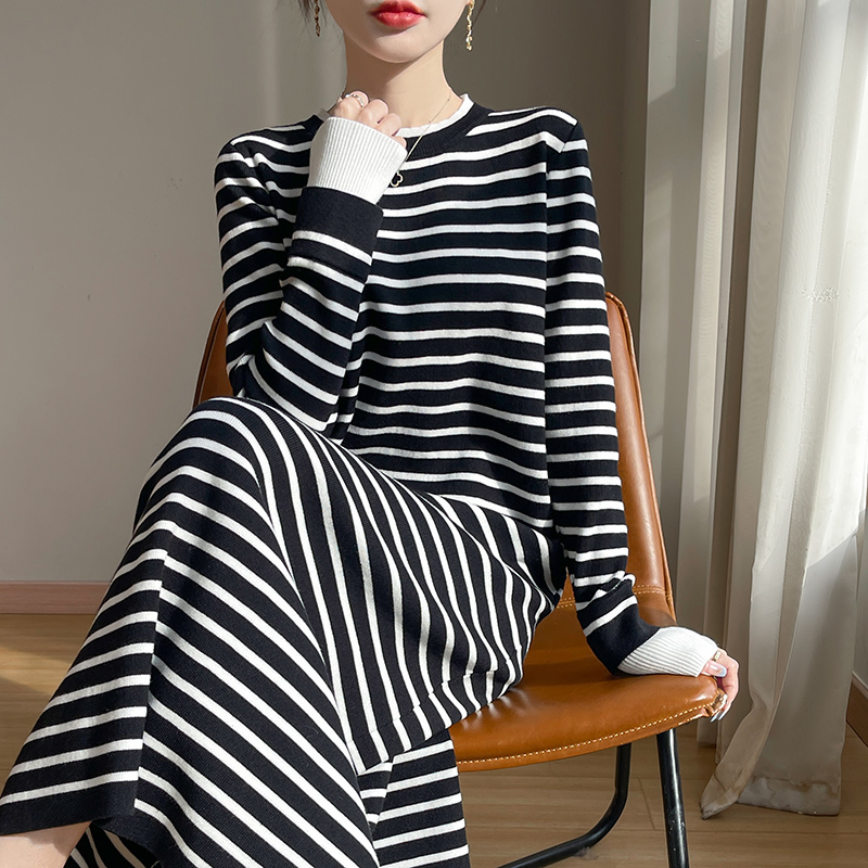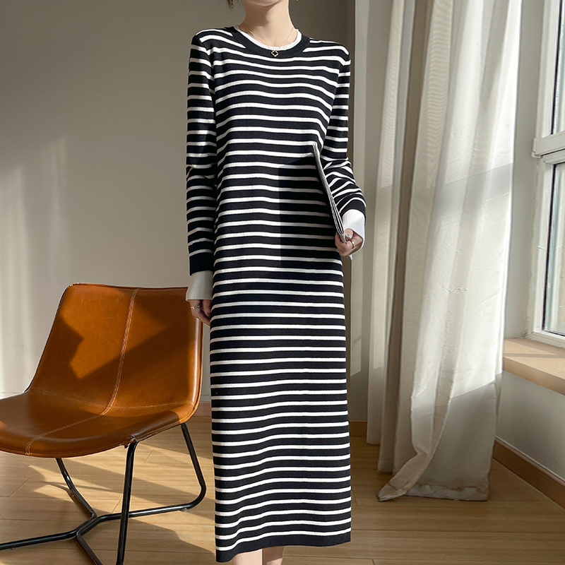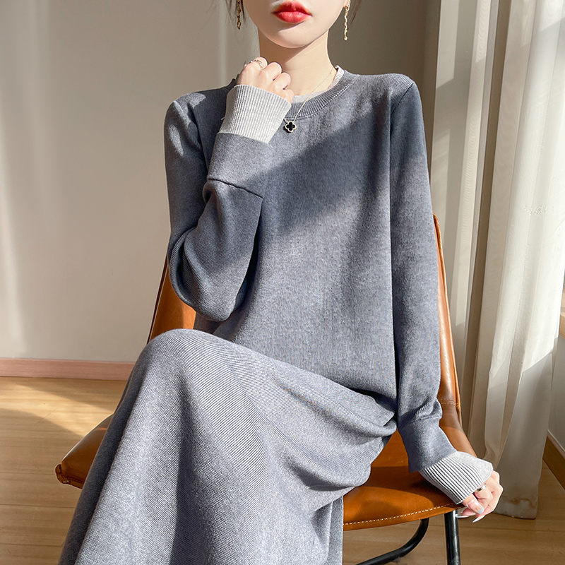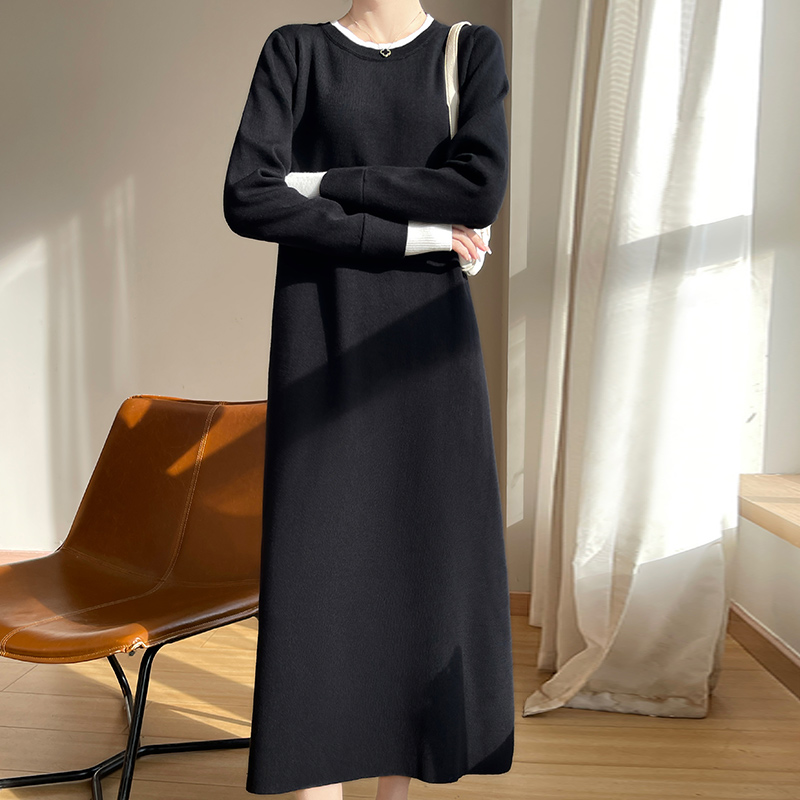 秋冬气质针织长裙长款打底裙慵懒显瘦假俩件直筒宽松连衣裙毛衣裙