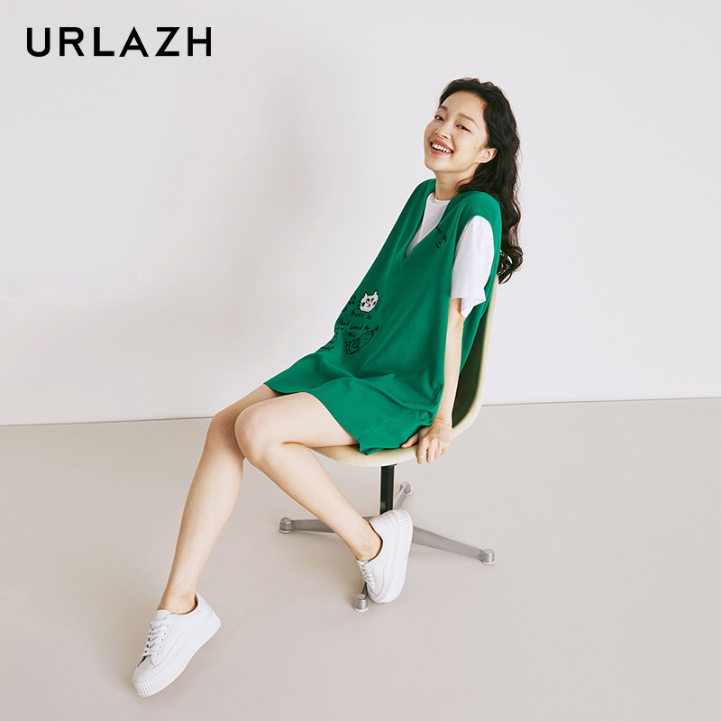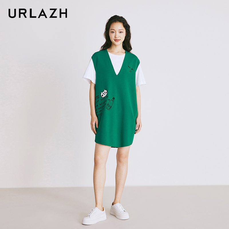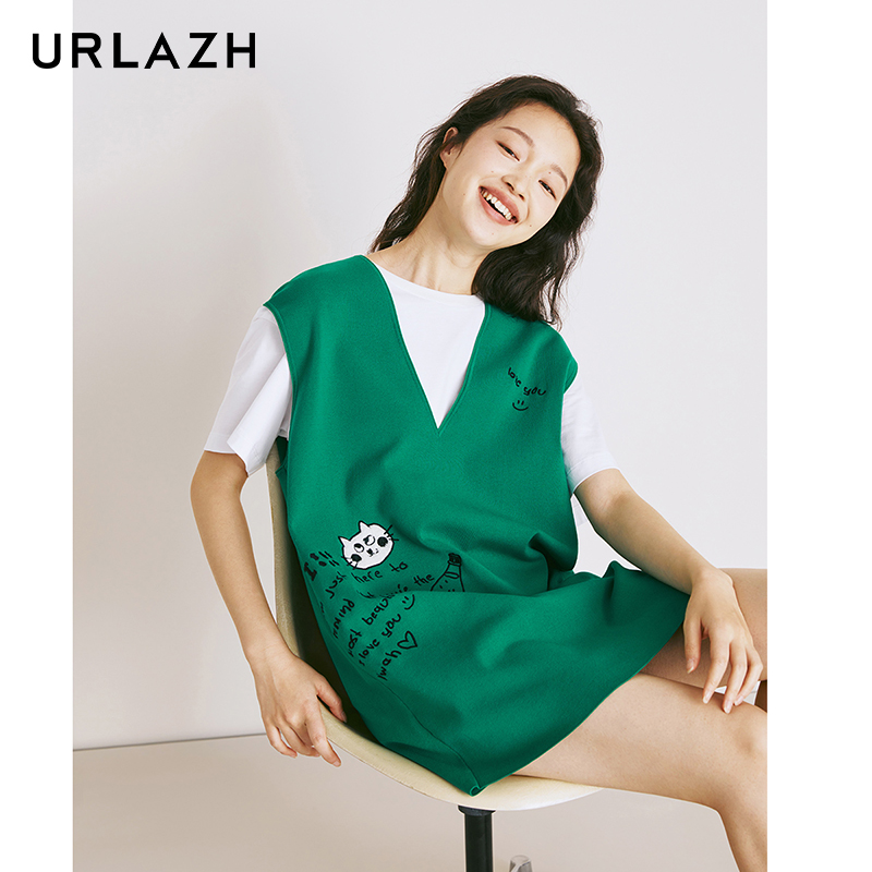URLAZH有兰夏季新款U等等猫咪绣花宽松减龄两件套针织背心连衣裙