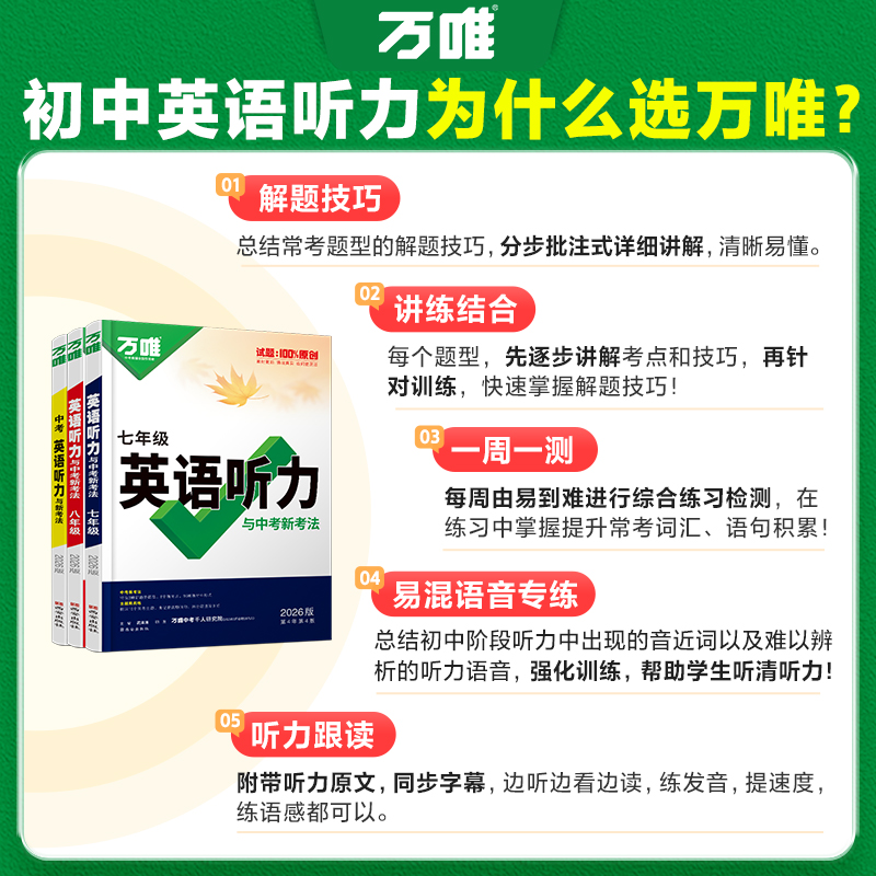 2026万唯中考初中英语听力专项训练八九七年级英语听力组合完形填空阅读理解词汇语法人教初一二三上册下册听力全套万维教育