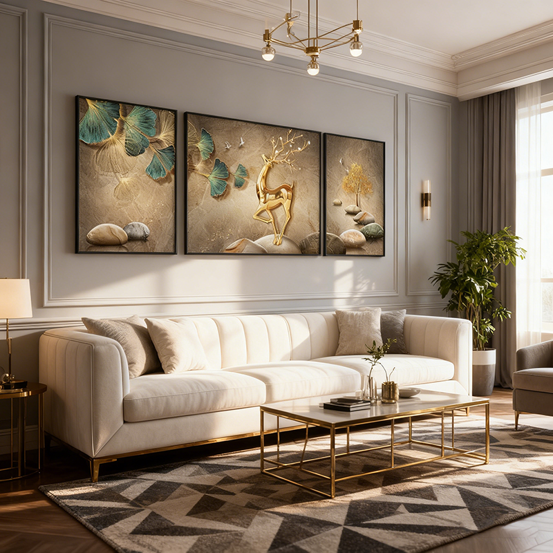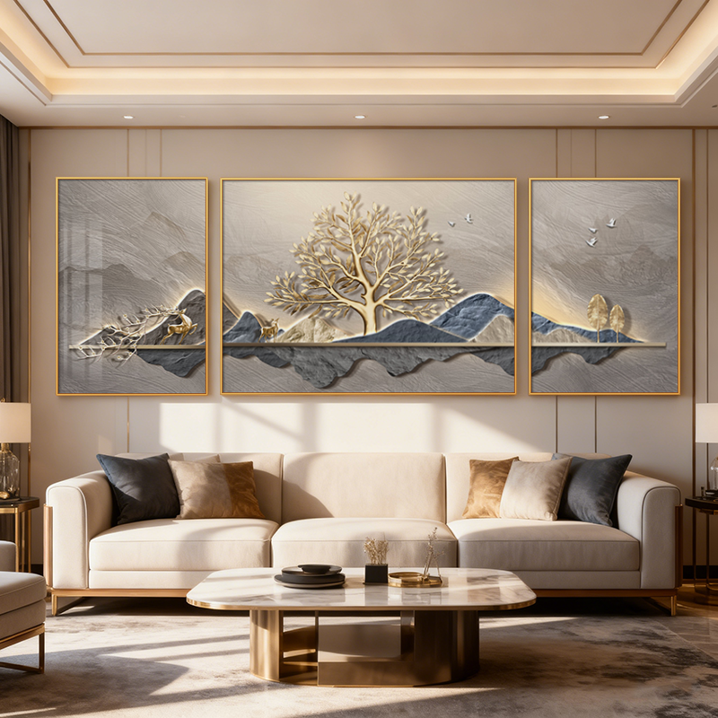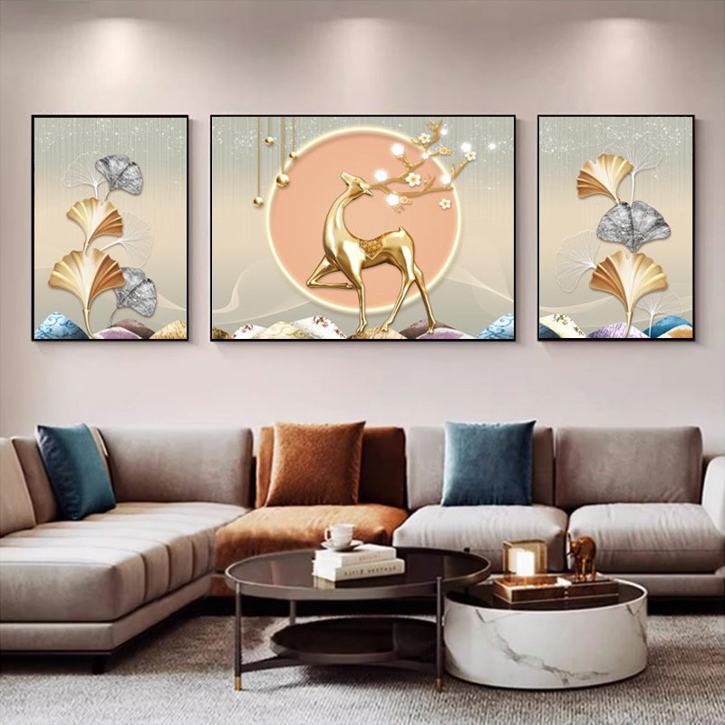 现代轻奢客厅三联装饰画大气沙发背景墙挂画高级感靠山福鹿壁画