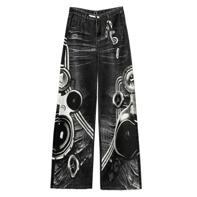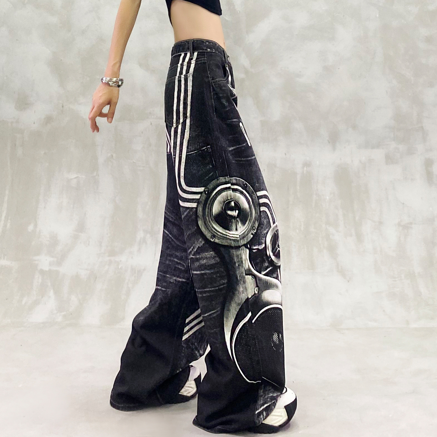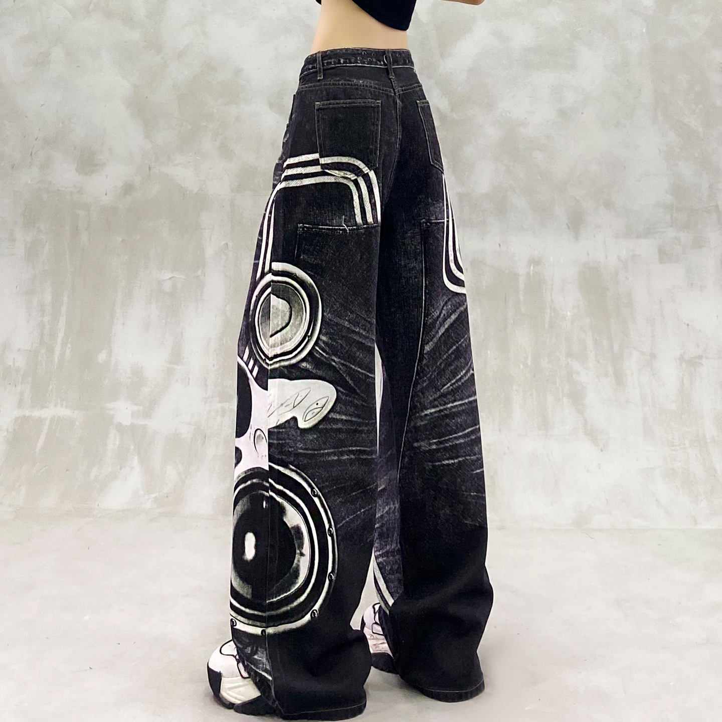 炫酷卡通印花设计水洗牛仔裤女秋新款高腰宽松显瘦百搭直筒阔腿裤