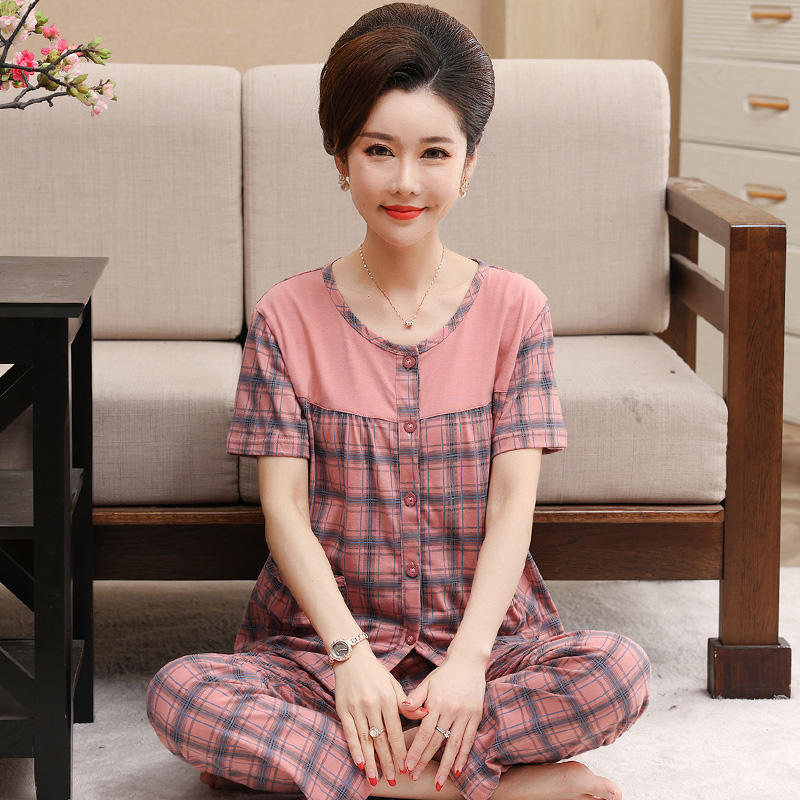 长袖纯棉薄款睡衣中年女士妈妈圆领套装中老年人春秋加大码家居服