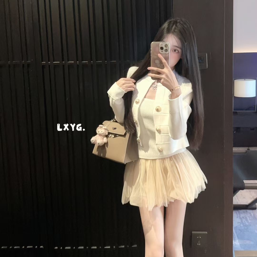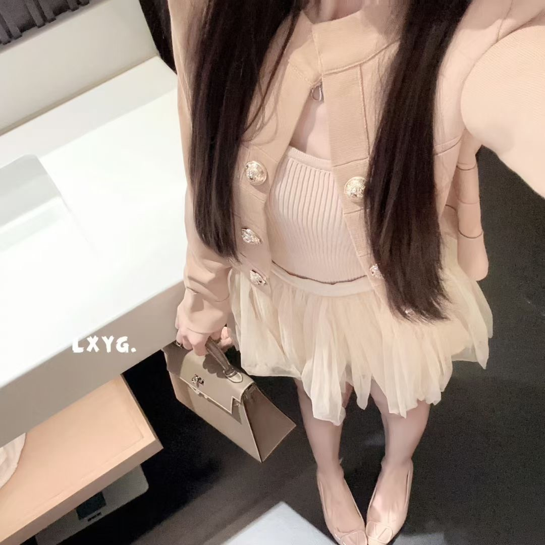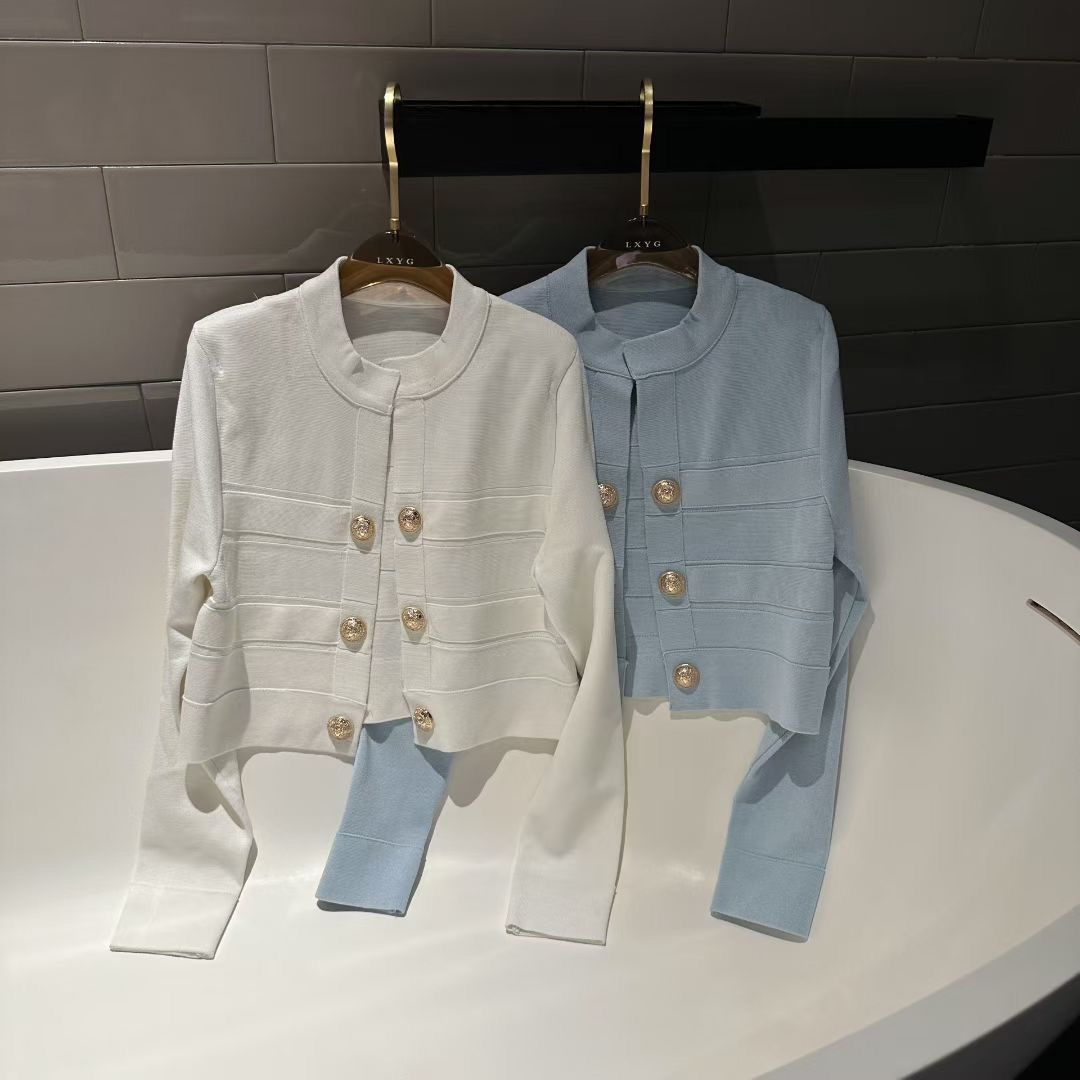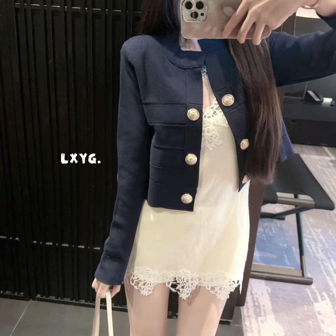 LXYG明星同款高级感气质双排金属扣纯色针织开衫女短款上衣外套秋
