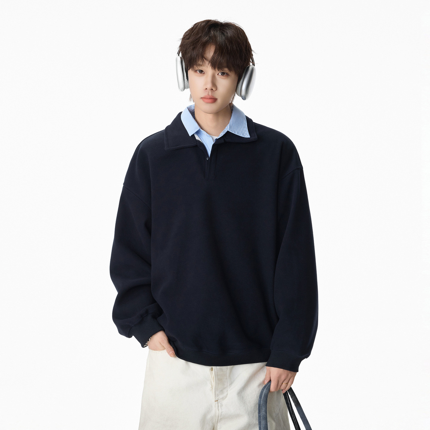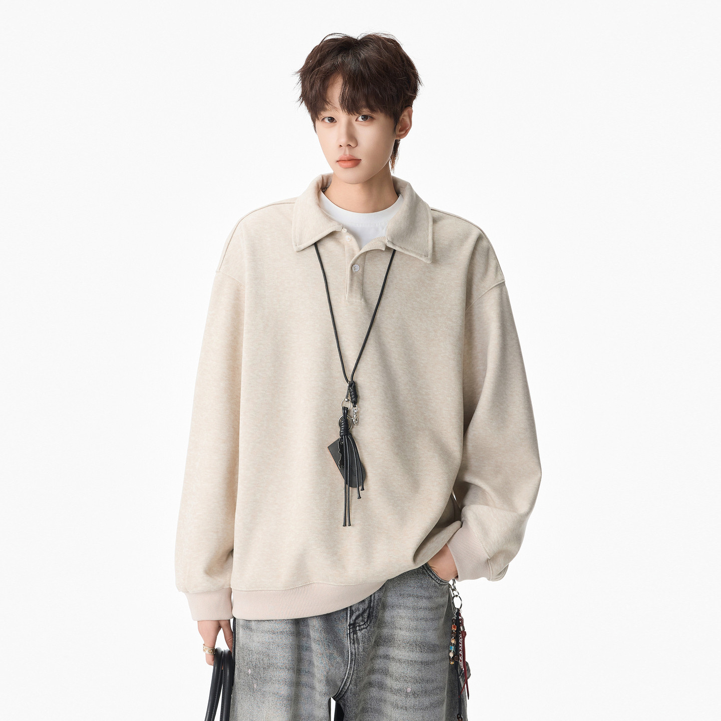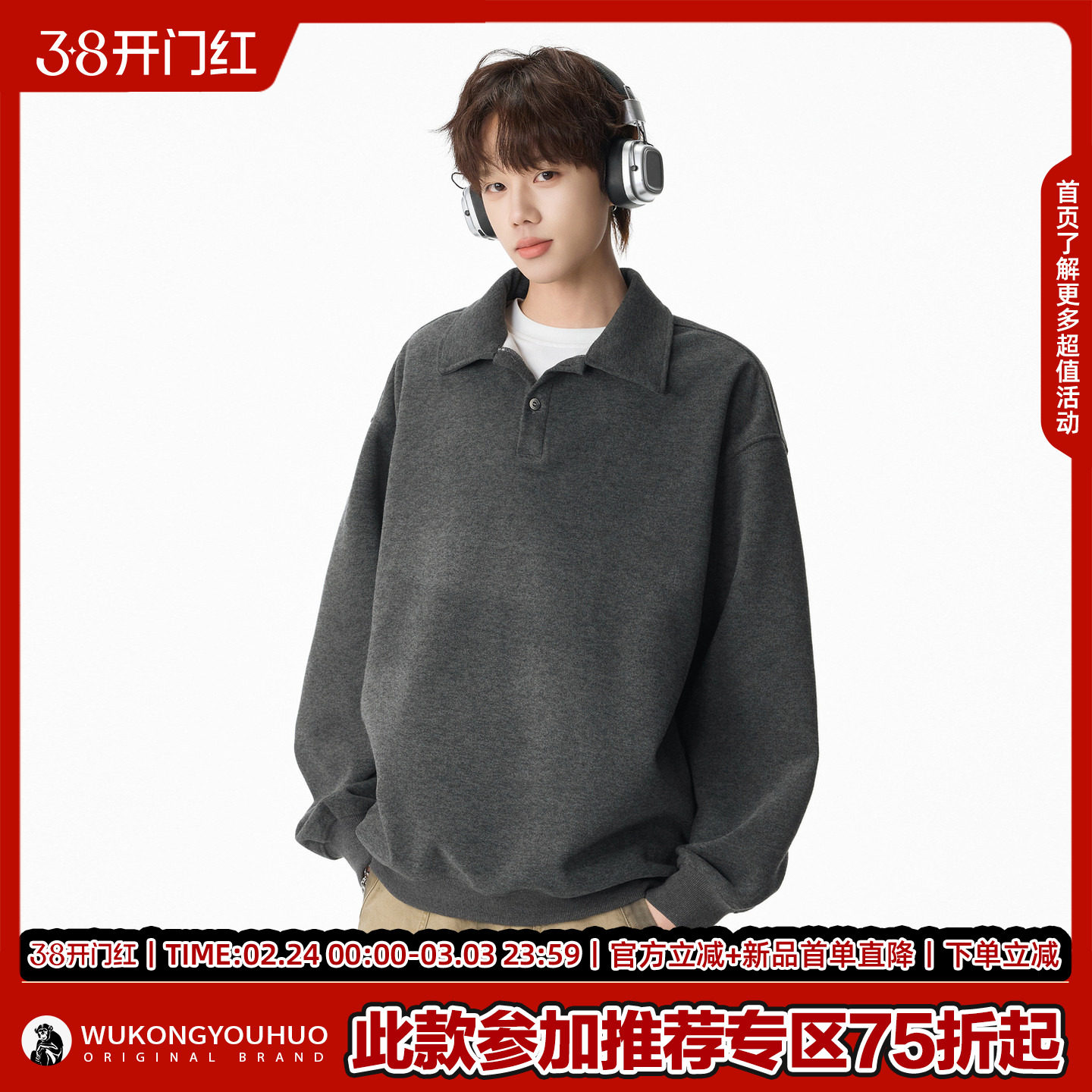 悟空有货复古潮牌纯色重磅长袖POLO衫男春季宽松情侣百搭套头上衣