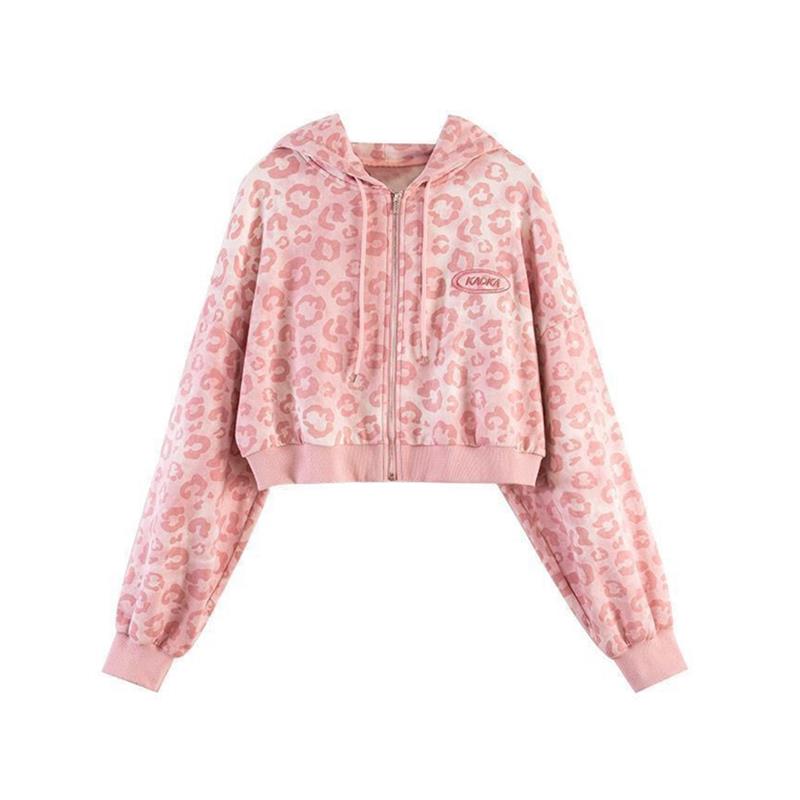 2025粉色豹纹短款开衫外套女春秋新款宽松港风复古连帽卫衣潮