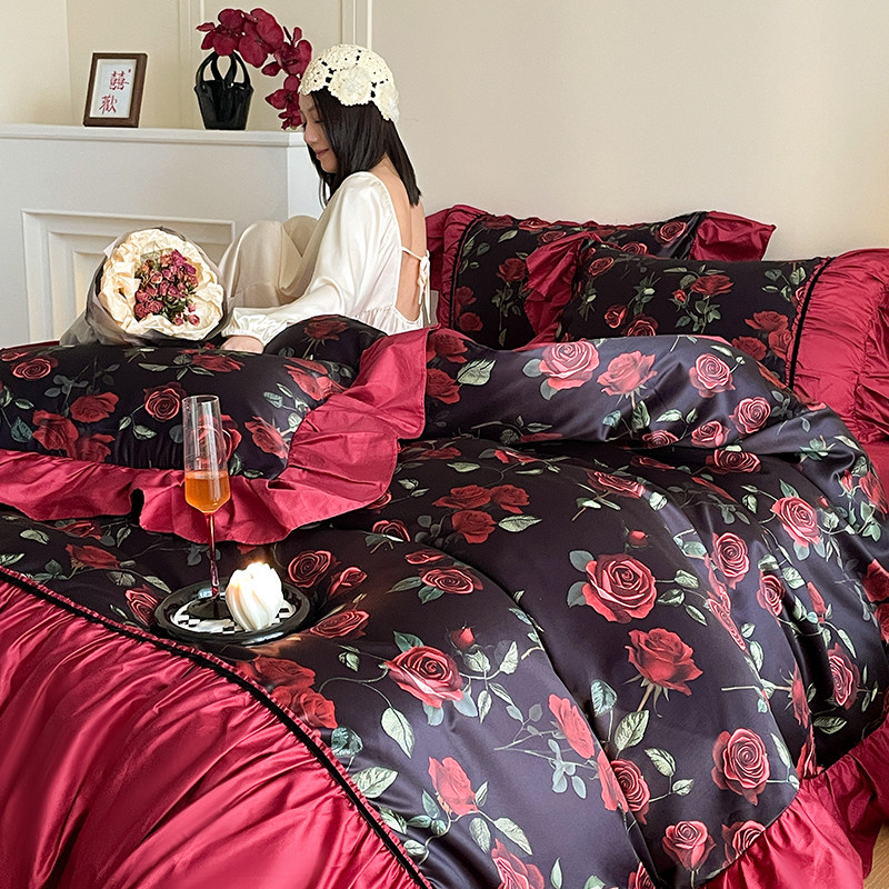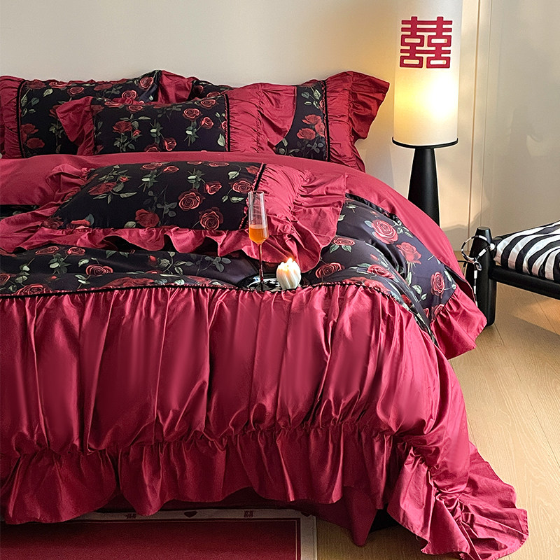 法式复古玫瑰全棉床单款四件套纯棉母婴棉少女公主风荷叶花边被套