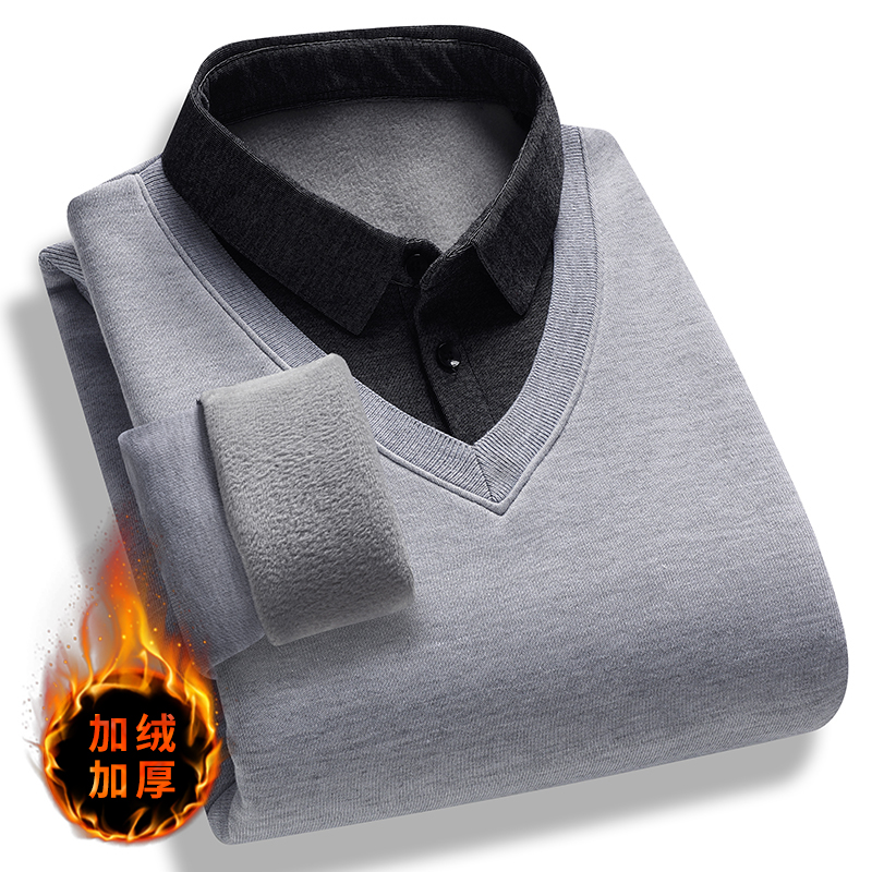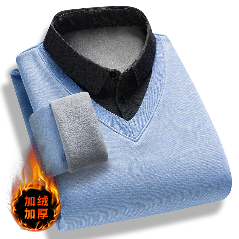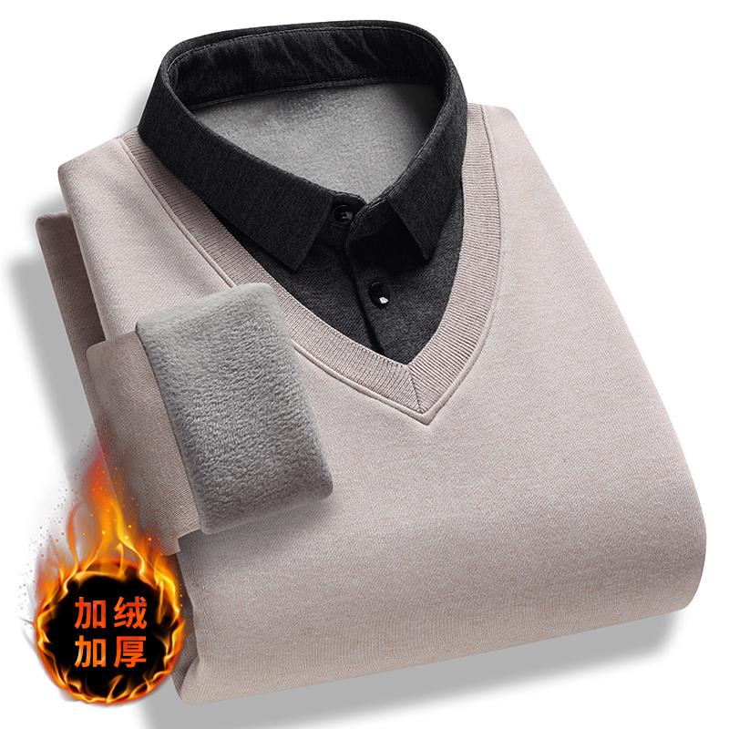 2025新款冬季加绒加厚保暖毛衣男士一体绒打底衫上衣衬衫领假两件