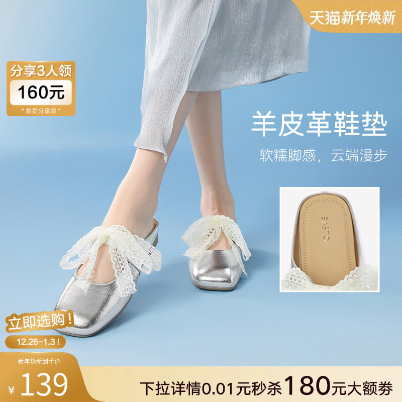 【欧若拉】百思图25夏商场新款蕾丝蝴蝶结穆勒拖外穿女鞋F5192BH5