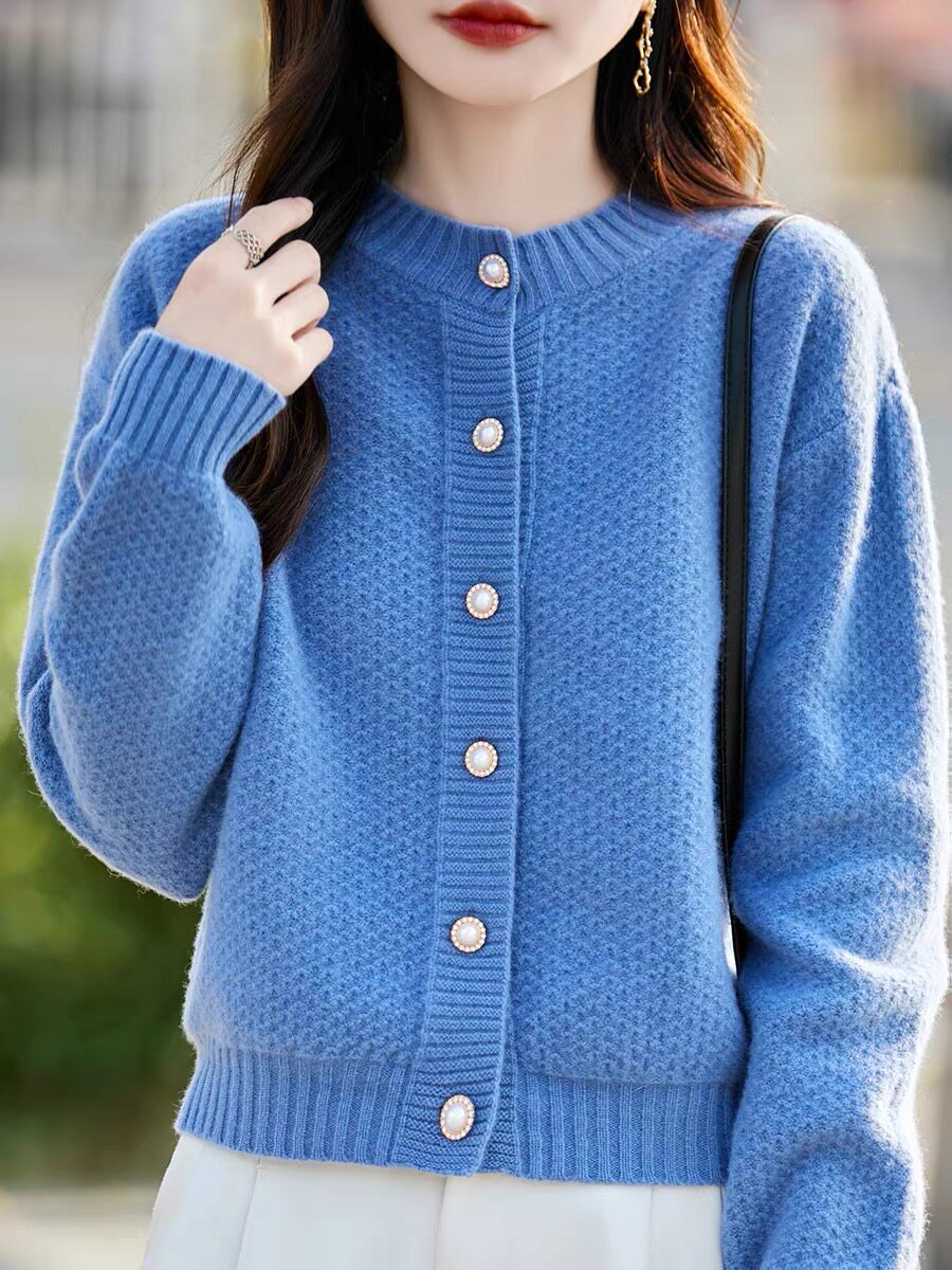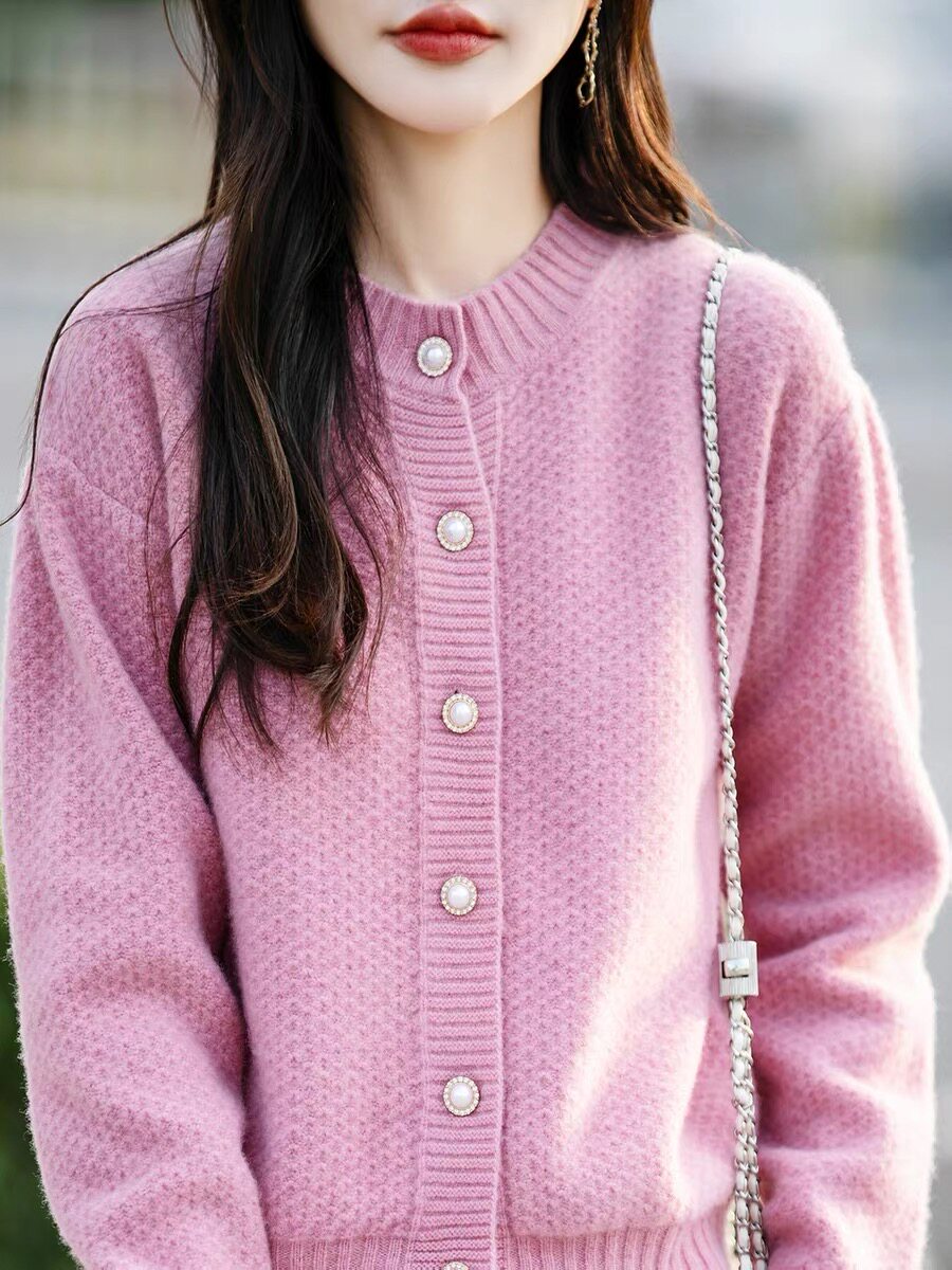 100%纯羊毛开衫女秋冬圆领宽松针织毛衣外搭短款洋气外穿小外套