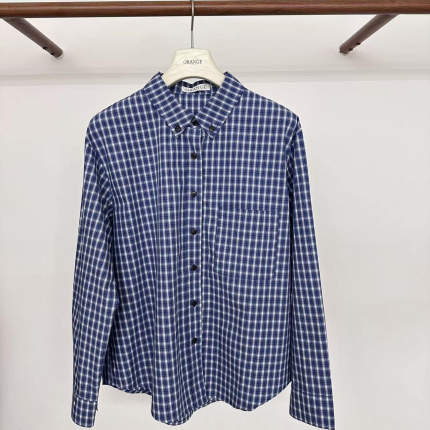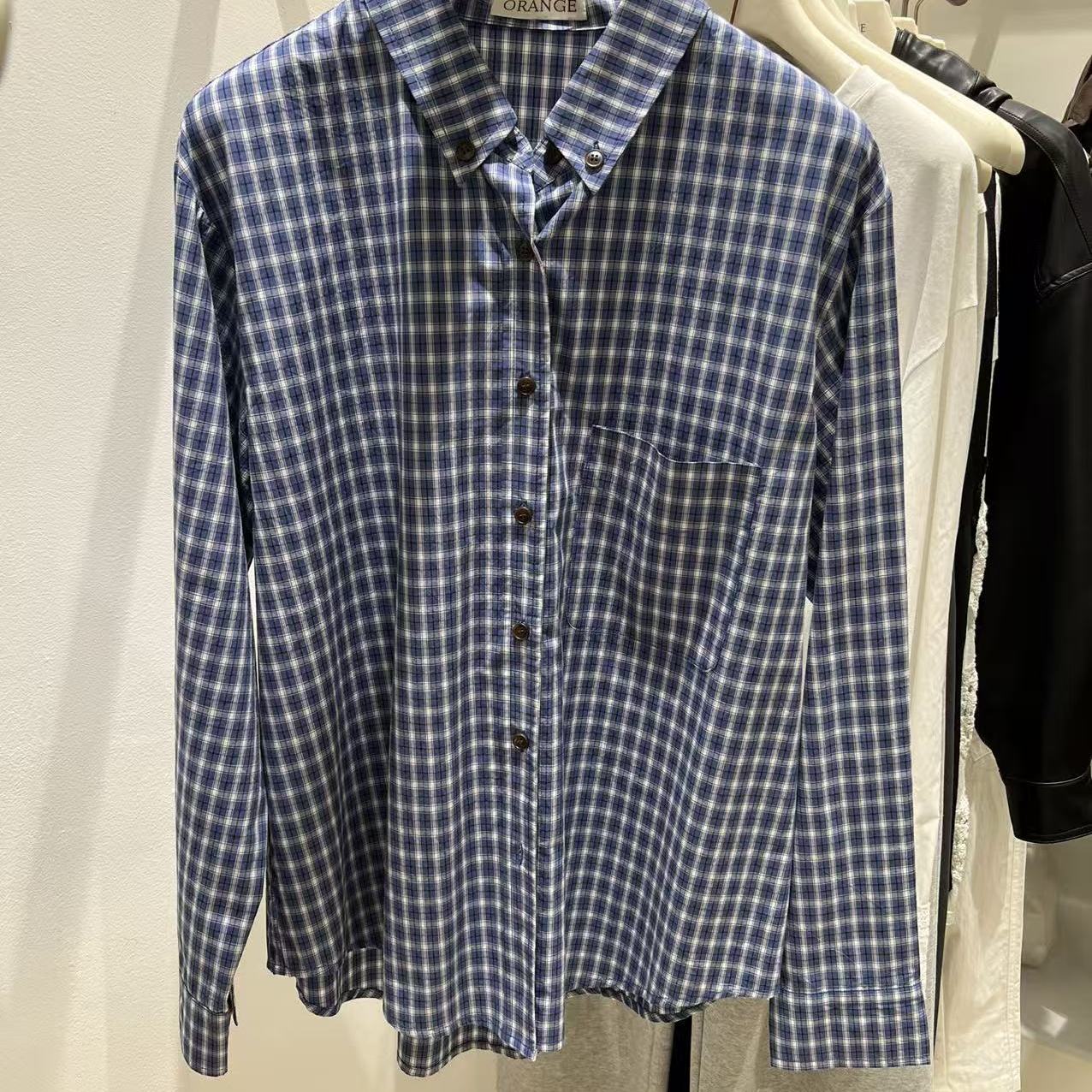 全棉复古显白蓝色格子衬衫宽松显瘦百搭长袖中长款衬衣上衣女秋季