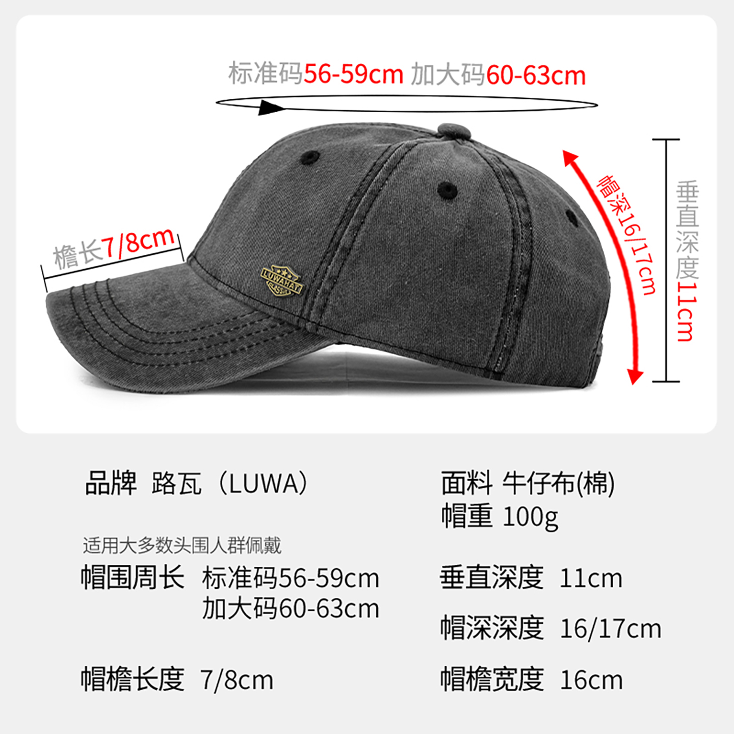 路瓦韩版牛仔布棒球帽四季大头围帽子水洗做旧鸭舌帽男户外百搭女