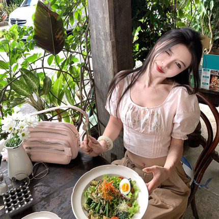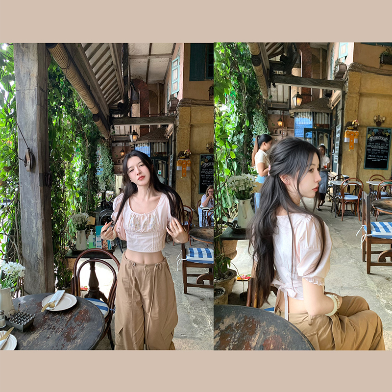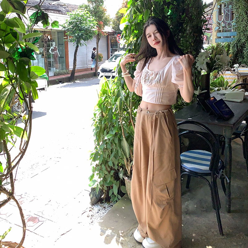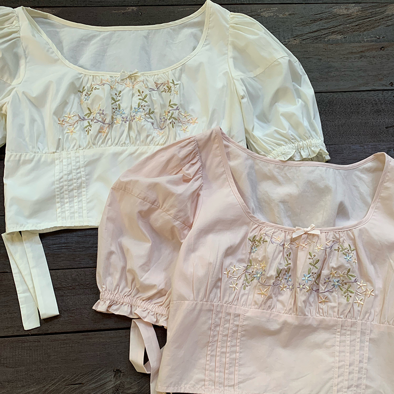 渔小平 盛夏花园 泡泡袖衬衫女夏季甜辣减龄刺绣高腰显瘦别致上衣