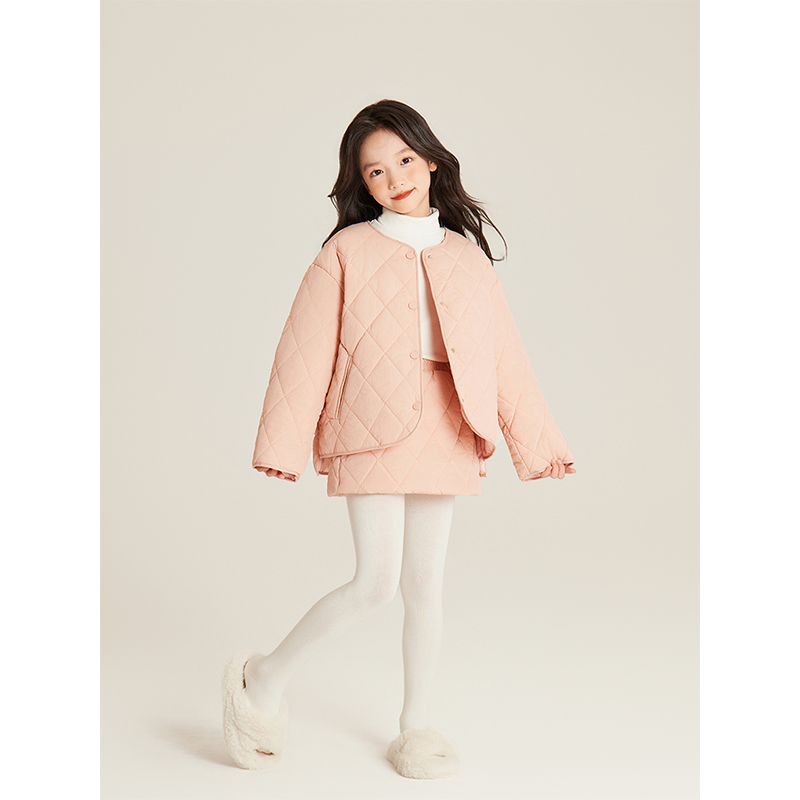 Amybaby女童套装冬季2025新款菱格纯色圆领保暖棉服半身裙