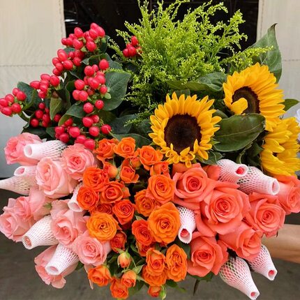 玫瑰四件套鲜花组合向日葵康乃馨百合送人节日插花水养昆明直发批