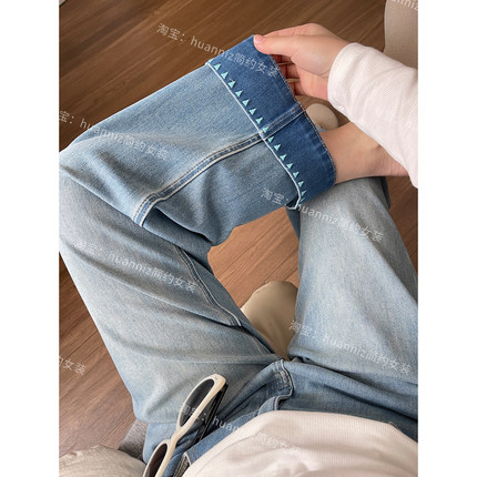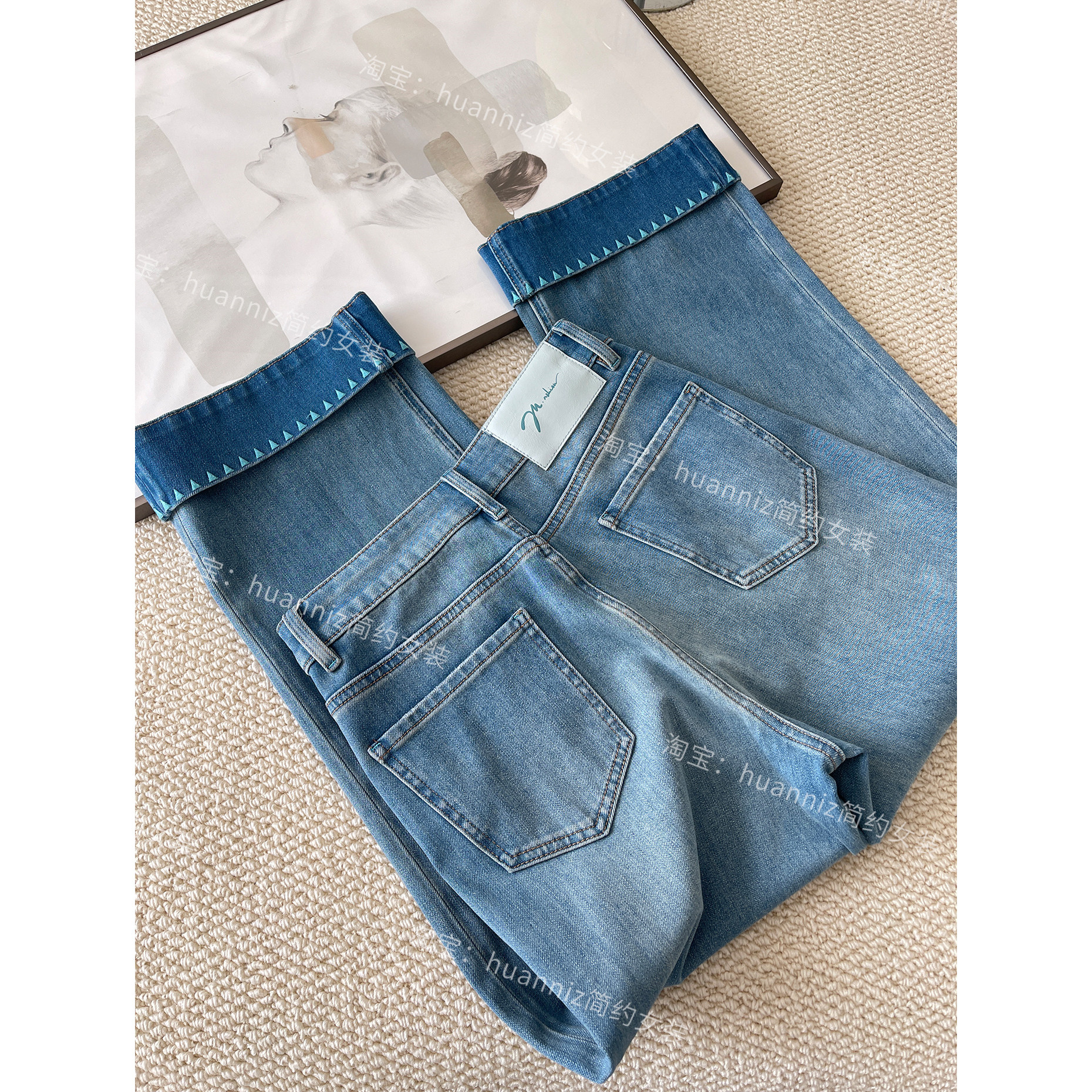 设计感刺绣翻边牛仔裤春季显瘦窄版阔腿九分裤四面弹柔软直筒裤女