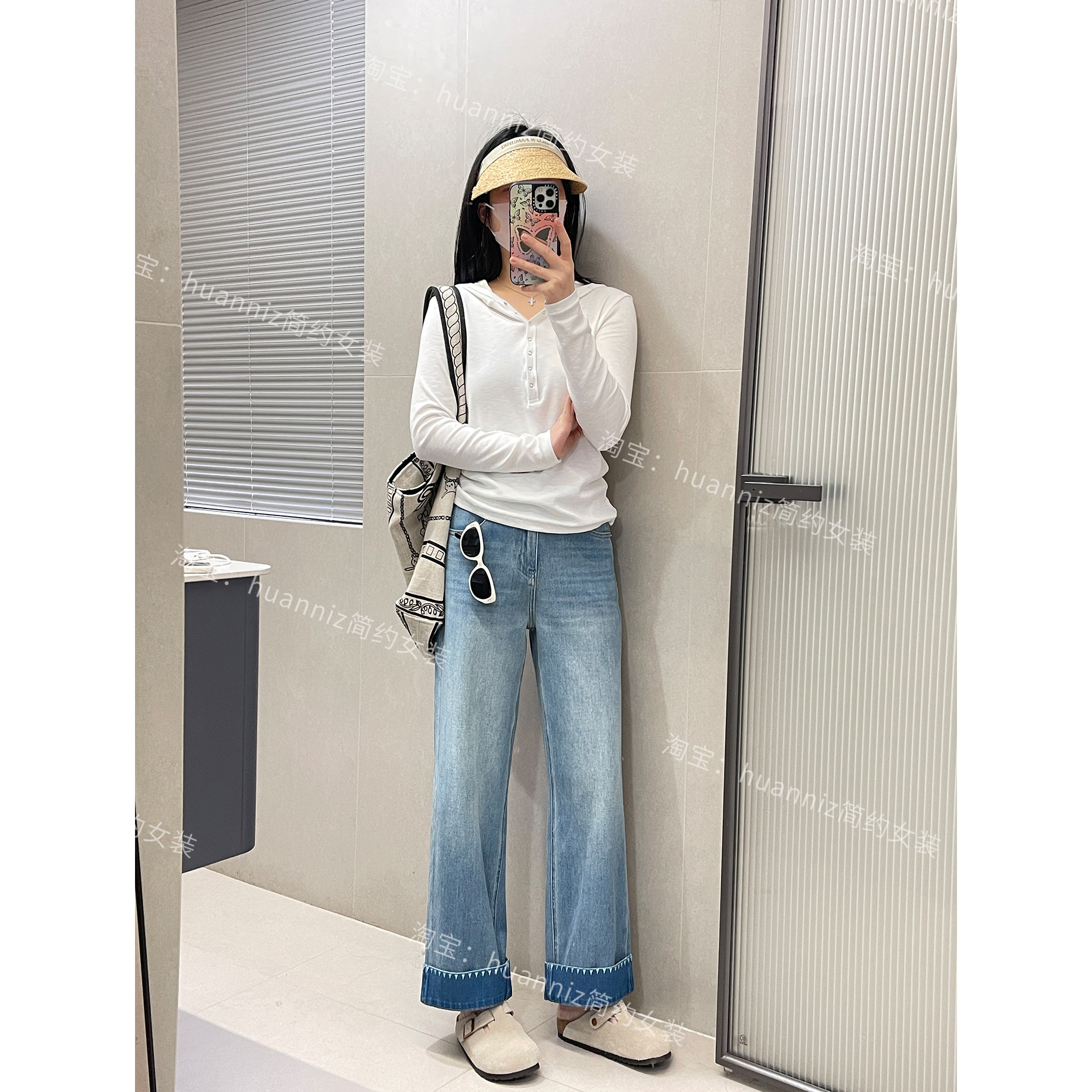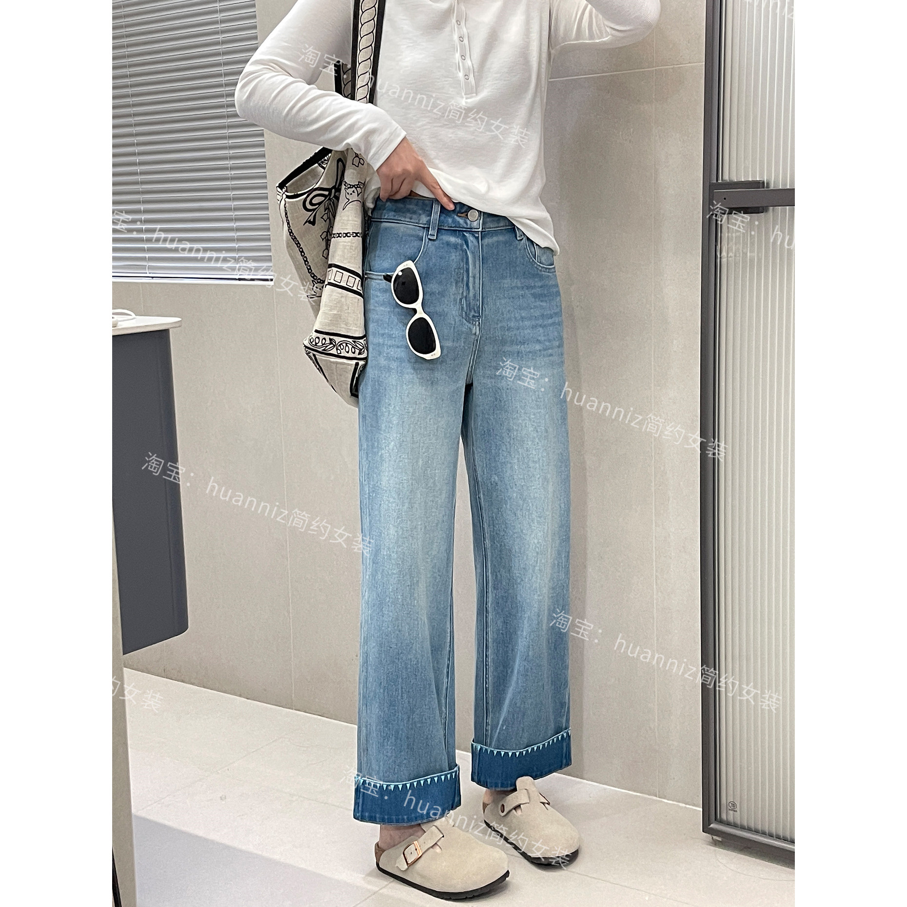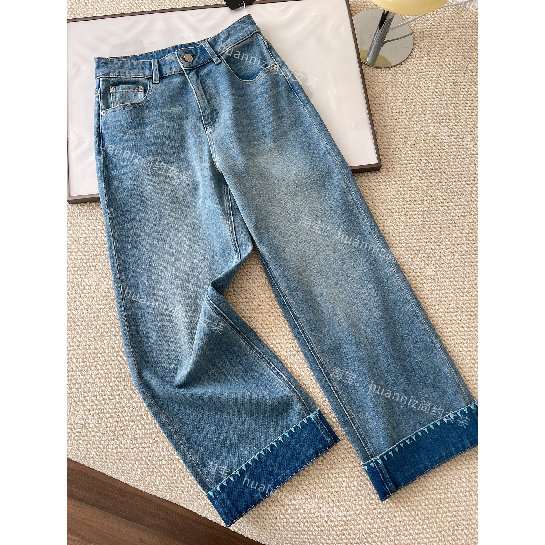 设计感刺绣翻边牛仔裤阔腿九分裤