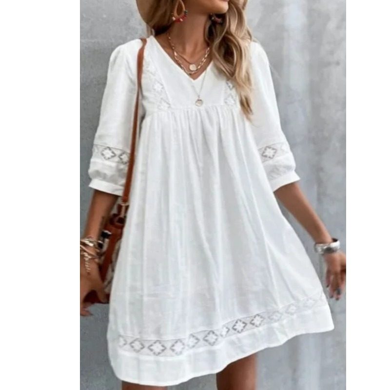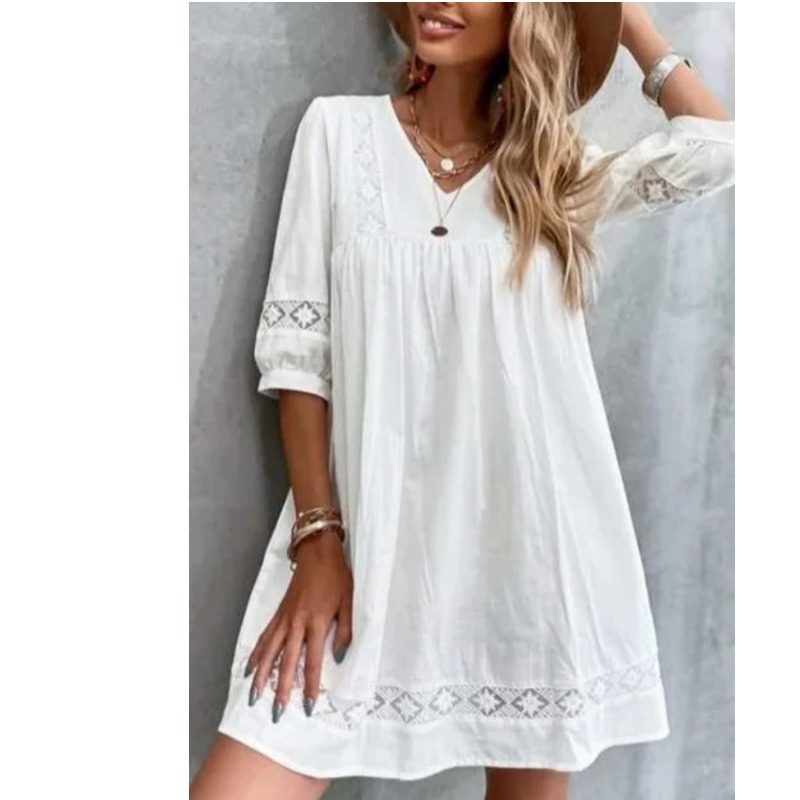 欧美V领白色宽松七分袖连衣裙