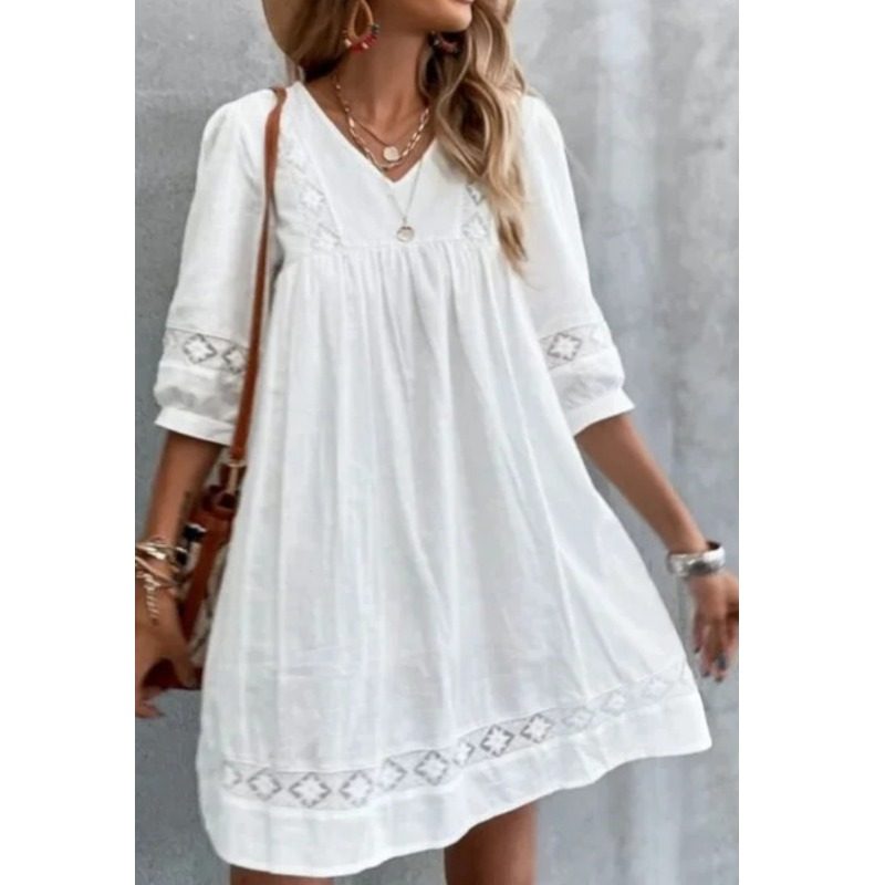 小个子清新欧美亚马逊V领时尚白色镂空宽松短袖连衣裙娃娃裙DRESS