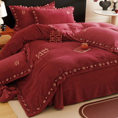 冬季牛奶绒四件套婚庆加厚珊瑚绒被套床单结婚酒红色保暖花边床裙