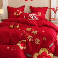 结婚床品全棉婚庆四件套陪嫁妆被套纯棉H红色床单婚嫁喜被床上用