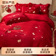 红豆高档牛奶绒四件套冬季珊瑚绒红色婚庆床上用品加厚床单床笠