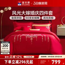 富安娜婚庆四件套红色60支长绒棉喜庆结婚纯棉大红婚嫁床单被套