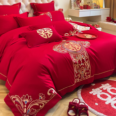 红豆A类全棉长绒棉刺绣婚庆四件组结婚中式红色被套床单新婚床品