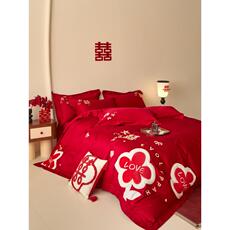 新中式婚庆长绒棉四件套婚礼床上用品红色结婚被套床单婚房六套件