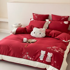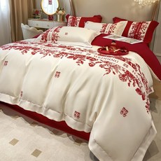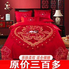 春夏瓣简约6棉0支纯婚四件套86529939欢喜花刺绣结婚红色被套床单